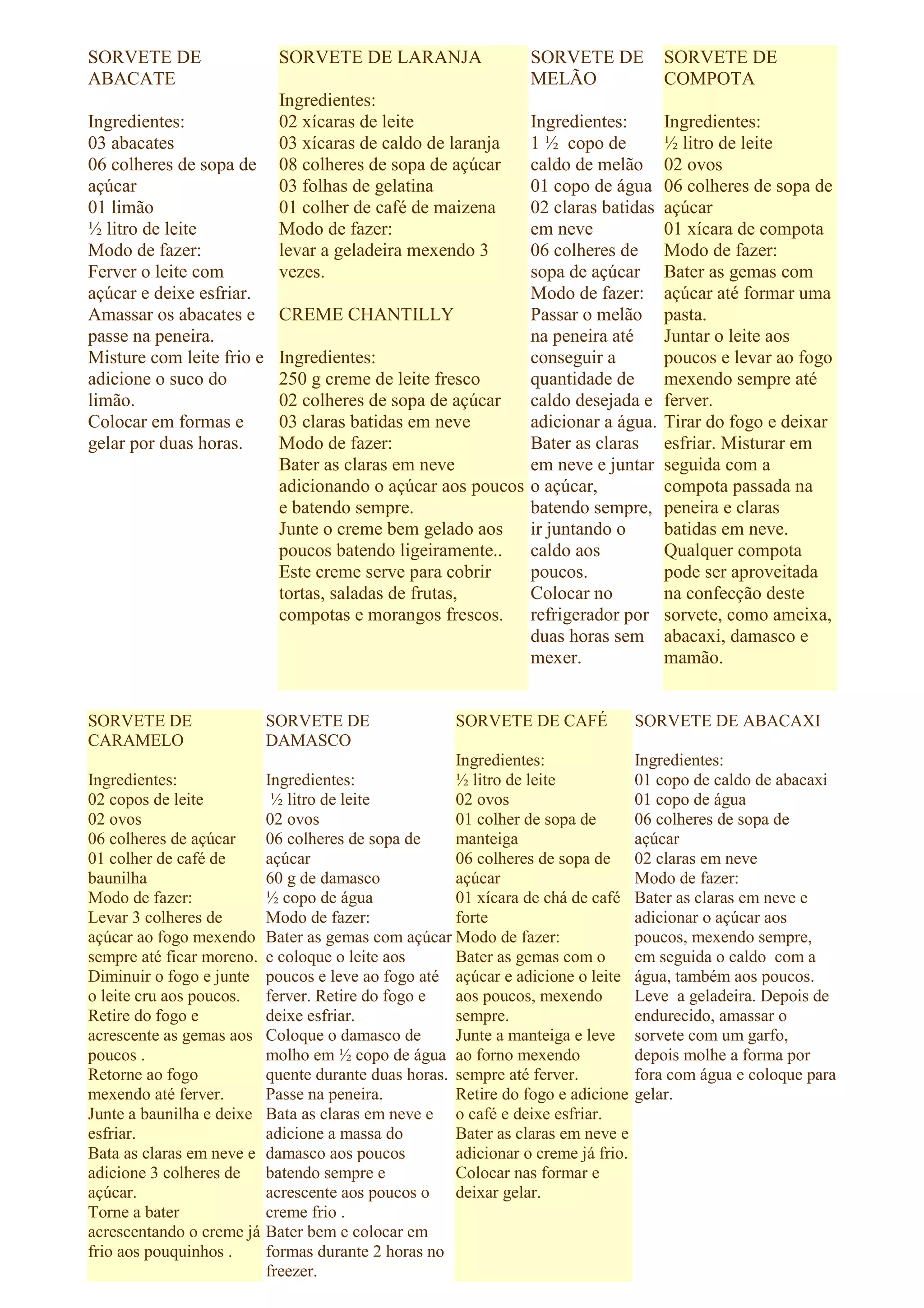 1) O documento fornece receitas para vários tipos de sorvete, incluindo sorvete de abacate, laranja, melão, compota, caramelo, damasco, café, abacaxi e outros.