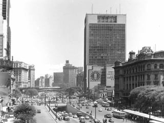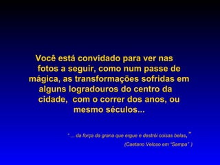 Este documento compara fotografias de vários locais do centro de São Paulo em diferentes épocas, mostrando as transformações ocorridas ao longo do tempo, como a construção e demolição de prédios e a modernização da infraestrutura urbana.
