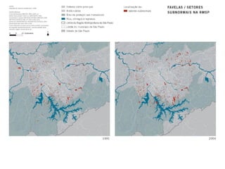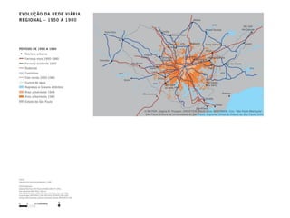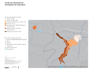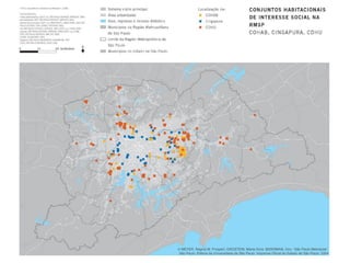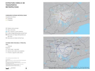 O documento discute as dinâmicas urbanas em São Paulo e na Região Metropolitana, incluindo a evolução da rede viária e da área urbanizada, a periferização, conjuntos habitacionais de interesse social, e a estrutura do sistema viário. Algumas dinâmicas específicas incluem a transformação de áreas industriais, a expansão de atividades terciárias, a consolidação de novas centralidades, a substituição de padrões socioeconômicos, e a precariedade nos conjuntos habitacionais.