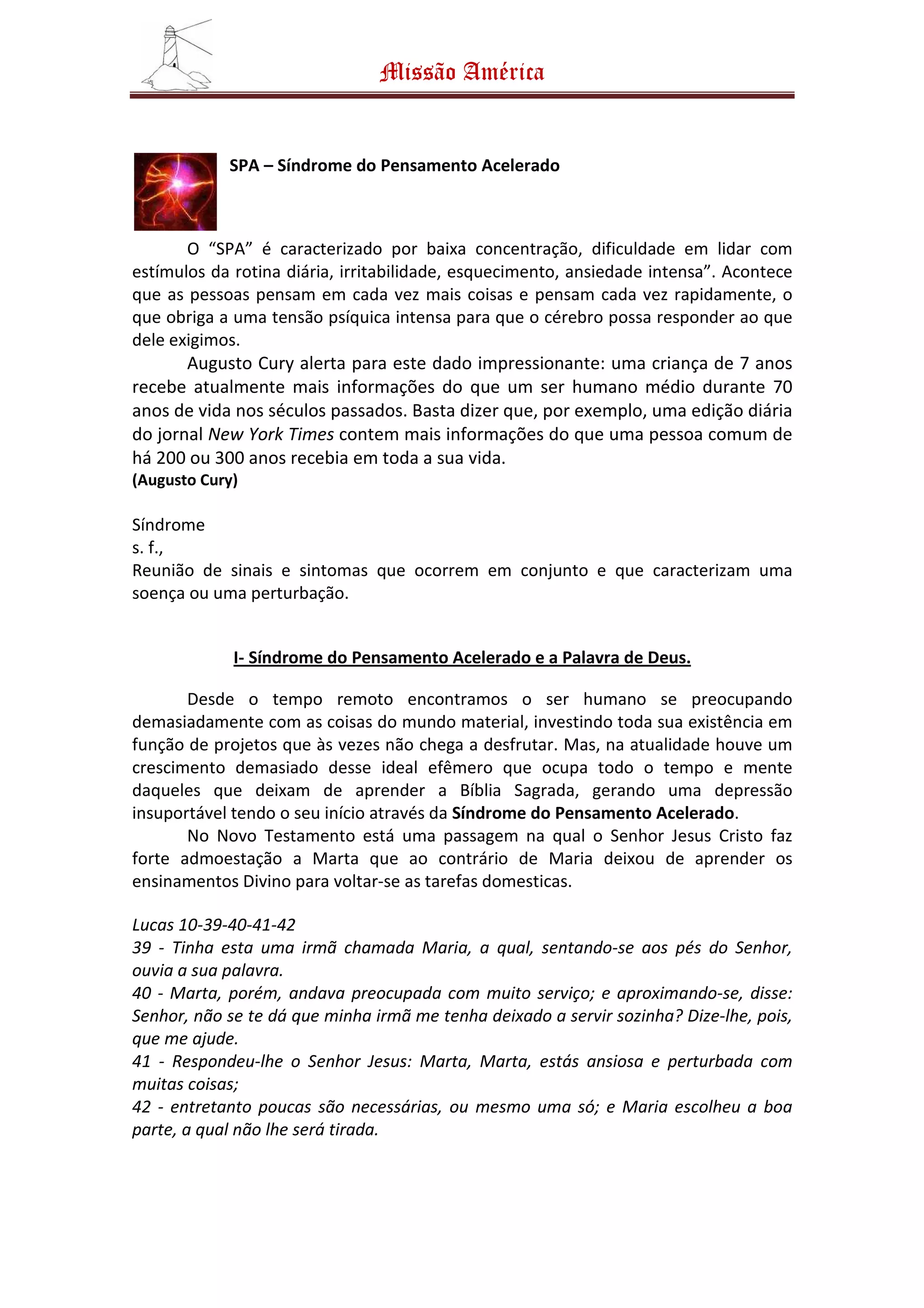 O documento discute a Síndrome do Pensamento Acelerado (SPA), caracterizada por baixa concentração e ansiedade causada pelo excesso de estímulos e informações recebidas atualmente. Também alerta que as pessoas devem aprender com Jesus e se concentrar nas coisas essenciais, como a Palavra de Deus, em vez de se preocuparem demais com projetos materiais.