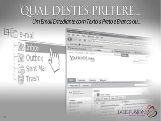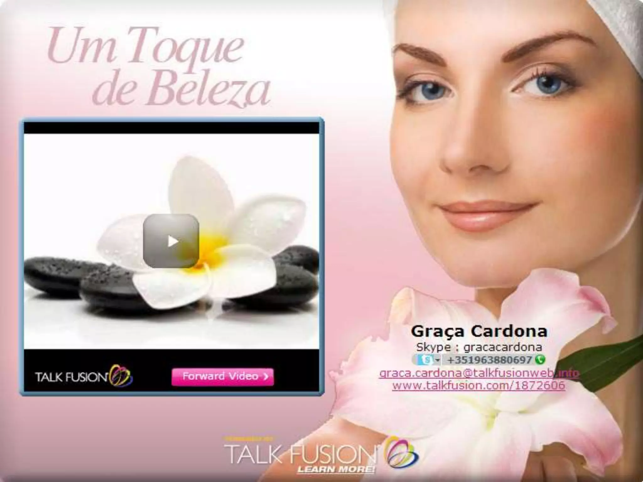 O documento lista vários produtos e serviços de video marketing da Talk Fusion, incluindo video email, newsletters de vídeo, assinaturas de e-mail e autoresponder de vídeo, videoconferência, transmissão ao vivo e gravação de vídeo, e um mural virtual com vídeos. Exemplos ilustram como cada produto pode ser usado para promover tratamentos, agradecer clientes, celebrar feriados, divulgar novidades e realizar reuniões virtuais.
