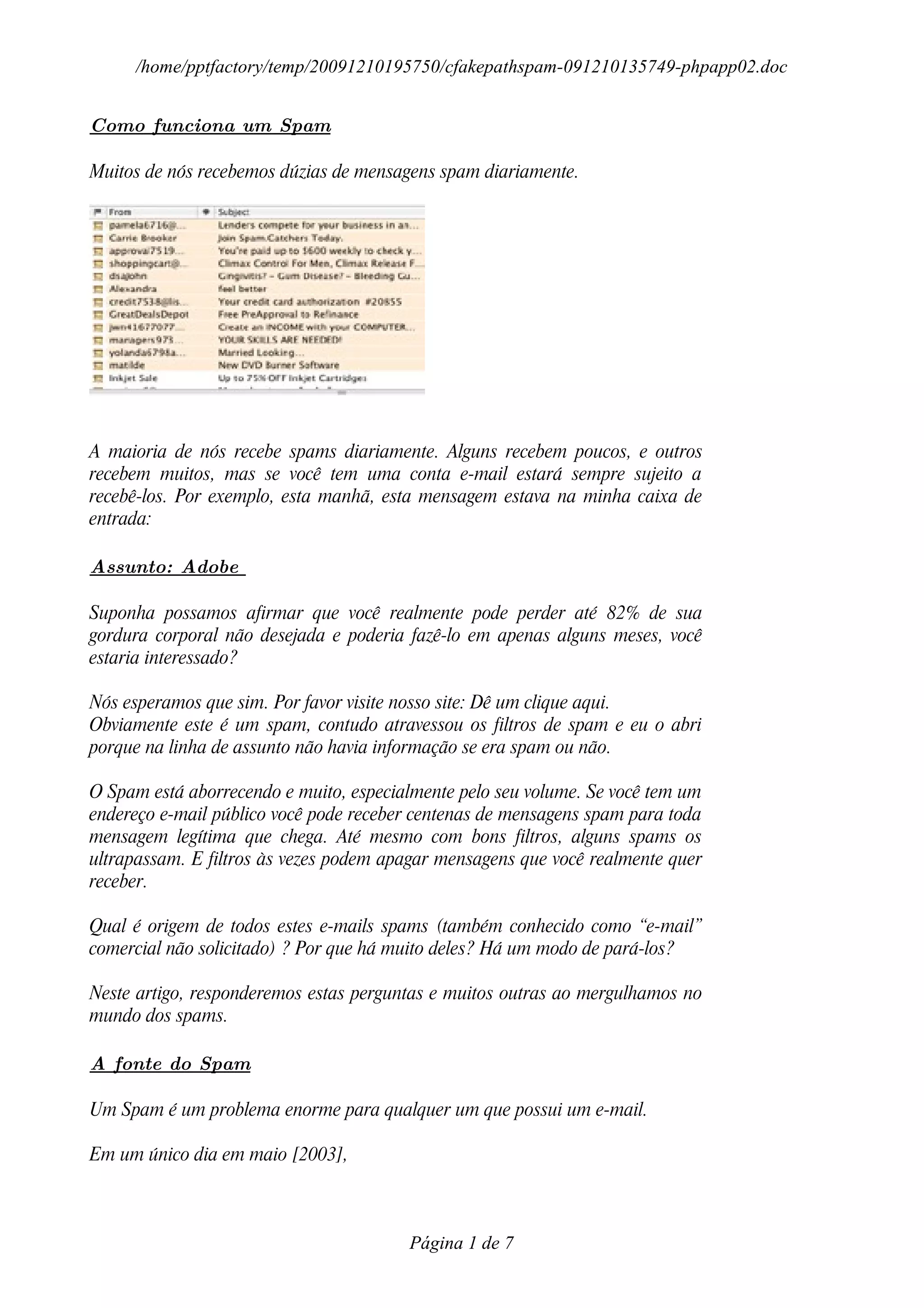 O documento discute como o spam funciona, incluindo como os spammers obtêm endereços de e-mail e enviam grandes quantidades de spam. Grandes empresas operam servidores em outros países para enviar bilhões de e-mails spam por dia, e usam técnicas como máquinas zumbis para driblar filtros anti-spam. Leis anti-spam tentam combater o problema, mas spammers encontram maneiras de contorná-las.