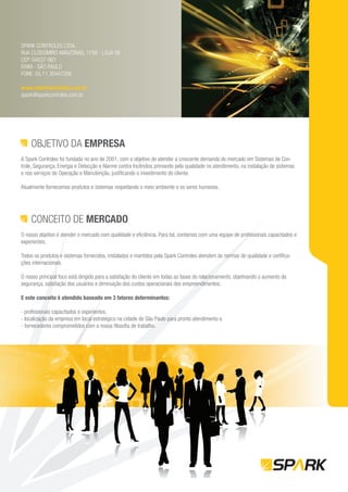 O documento descreve os detalhes da empresa Spark Controles Ltda, incluindo sua localização, contatos, objetivos, conceitos de mercado, produtos e serviços oferecidos, principais instalações e clientes.