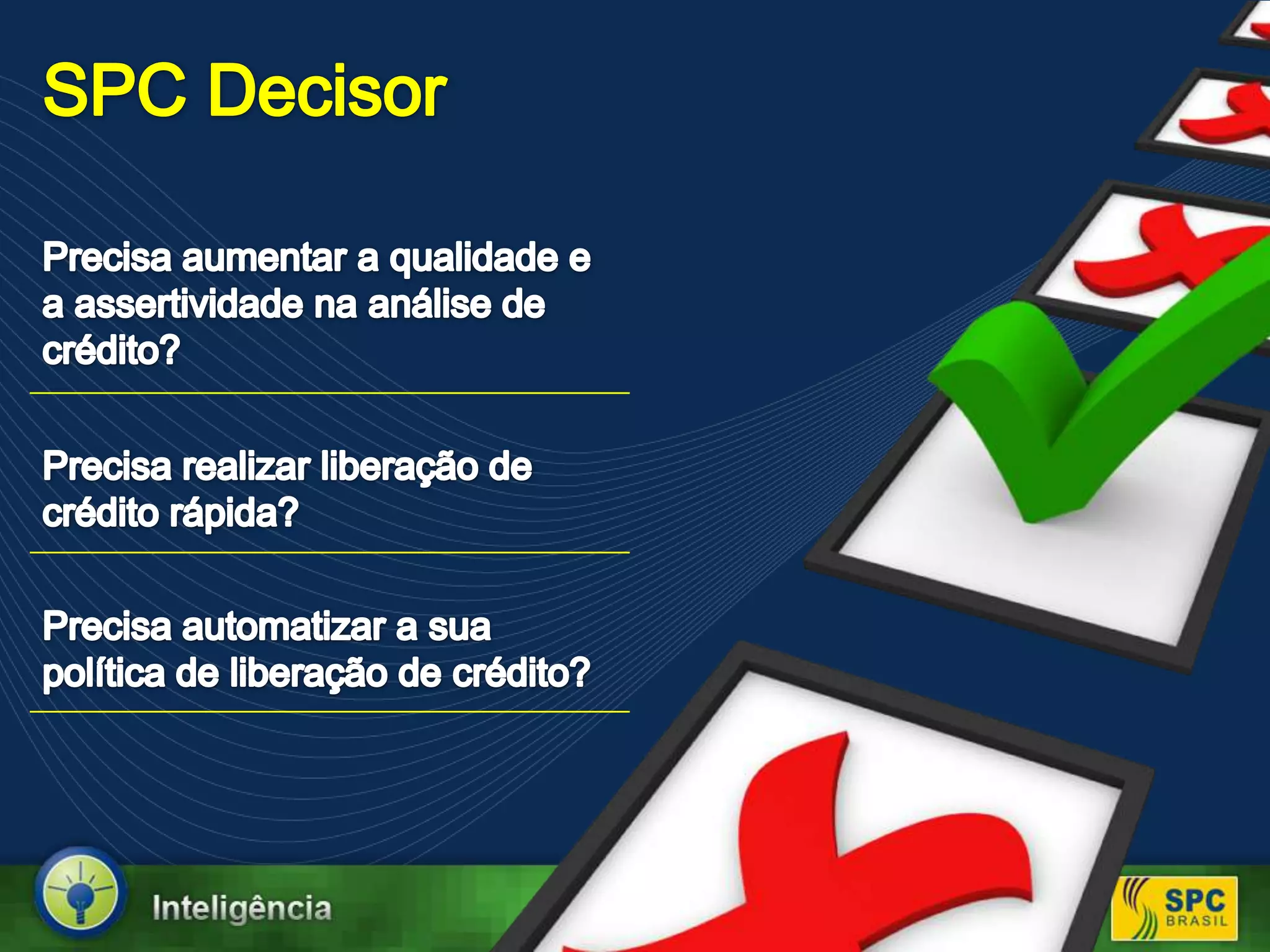 O SPC Decisor é uma ferramenta que automatiza a análise de crédito, permitindo acesso a diversas fontes de informação e aumentando a assertividade na liberação de crédito. Ele oferece decisões rápidas, variando de 30 segundos a 35 minutos, com mais de 150 bases de dados integradas e personalização para cada cliente. Além disso, inclui uma solução hospedada que reduz custos e recursos relacionados à instalação.