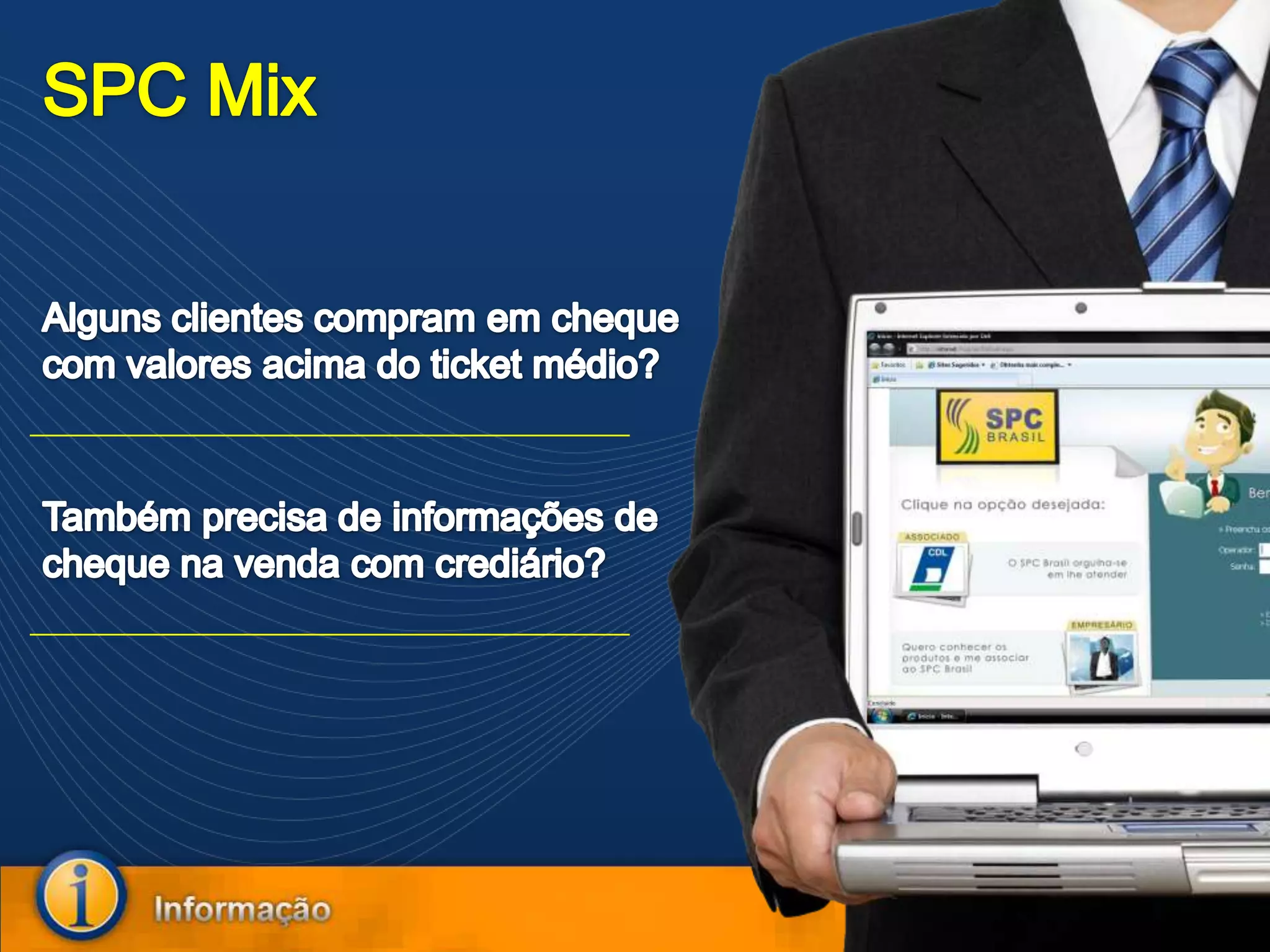 O documento descreve o produto SPC Mix, que fornece informações cadastrais e de crédito sobre pessoas físicas e jurídicas. O SPC Mix permite acessar dados do cadastro do SPC e ocorrências de cheques relacionadas ao CPF/CNPJ, além de confirmar dados e realizar consultas de crédito. O produto pode ser útil para vendas que envolvem cheques de valores mais altos ou vendas a crédito.