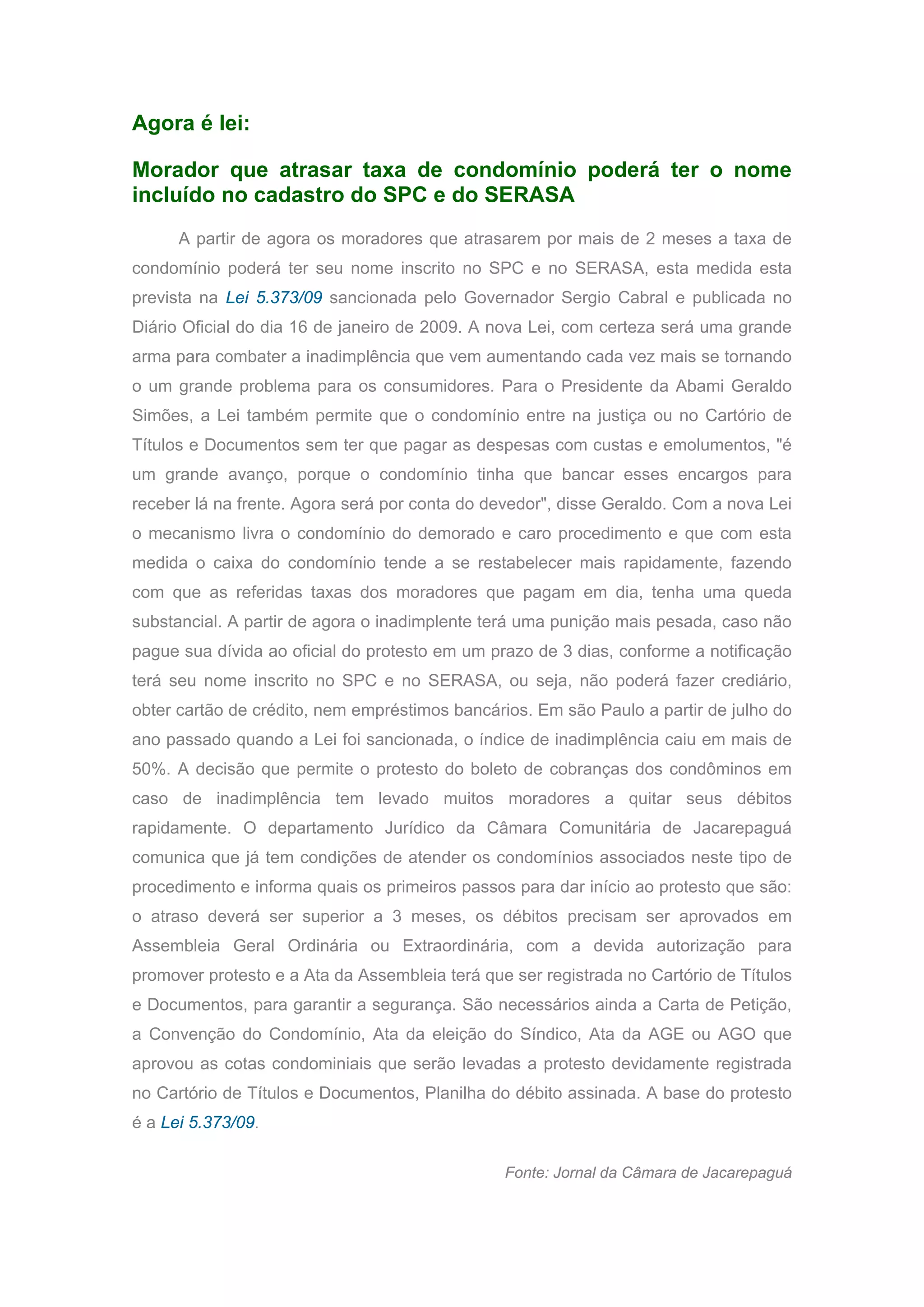 A nova Lei 5.373/09 permite que moradores com mais de 2 meses de atraso em taxas de condomínio tenham seus nomes inscritos no SPC e SERASA. A lei também isenta condomínios de custas judiciais para receber dívidas e levou a uma queda de mais de 50% na inadimplência em São Paulo. O protesto de boletos atrasados tem motivado moradores a quitarem dívidas rapidamente.