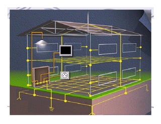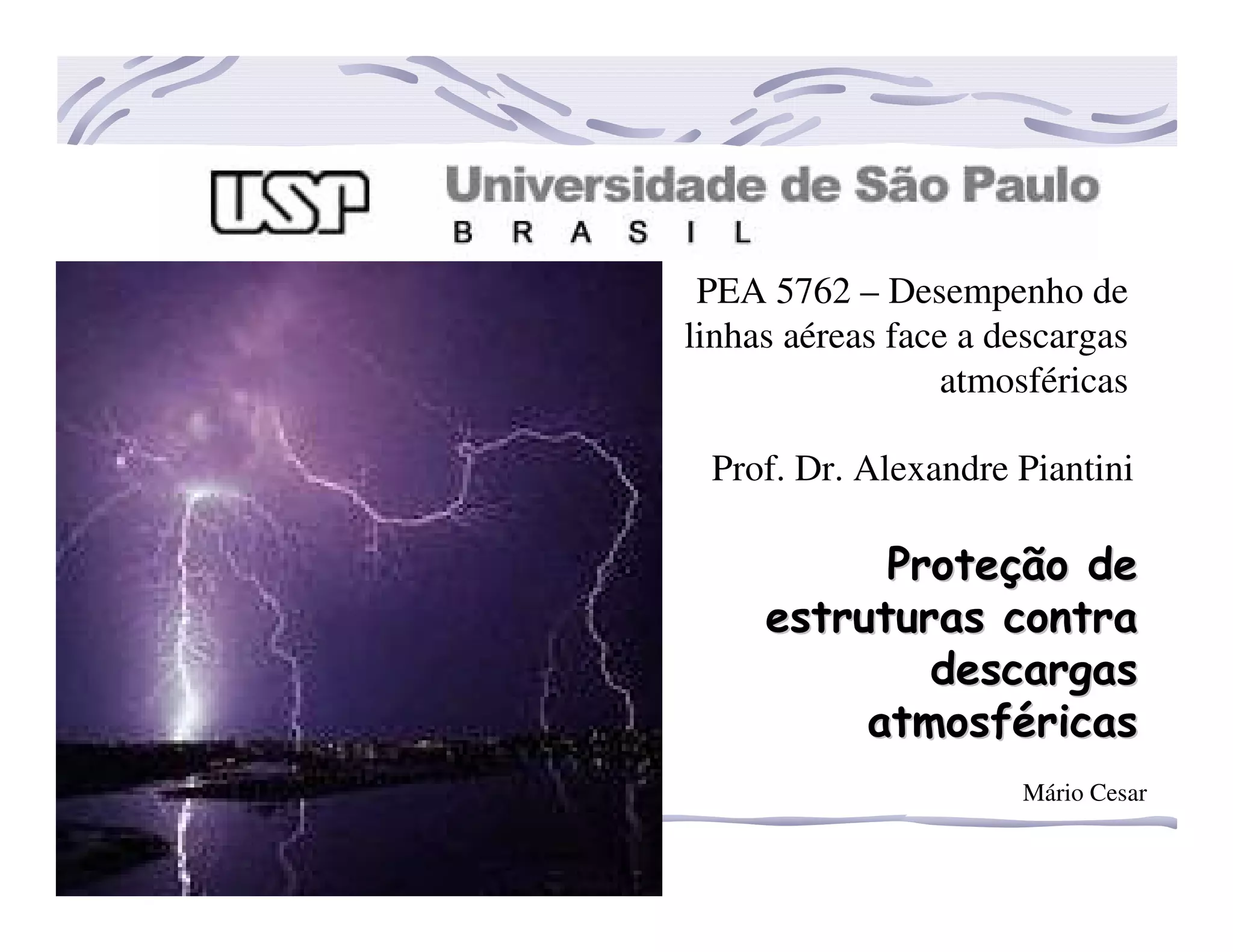 O documento discute sistemas de proteção contra descargas atmosféricas em estruturas, apresentando metodologias de acordo com a NBR 5419. Detalha níveis de proteção, métodos como gaiola de Faraday e modelos eletrogeométricos, além de componentes como captores, condutores e equalização de potencial.