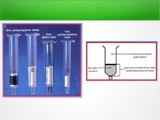 O documento discute o preparo de amostras para cromatografia por extração em fase sólida (SPE). A SPE é uma técnica que permite isolar e concentrar analitos de uma matriz complexa, removendo interferências. Ela requer menos solventes do que métodos tradicionais como extração líquido-líquido. O documento descreve os principais parâmetros e etapas da SPE como condicionamento, percolação, lavagem e eluição para separar analitos dos interferentes e concentra-los antes da análise cromatográfica.