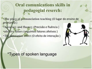 O documento aborda a produção oral e habilidades de comunicação em ensino de língua inglesa, discutindo temas como ensino de pronúncia, precisão, fluência, e fatores afetivos. Ele apresenta diferentes tipos de performance oral e princípios para ensinar linguagem de forma interativa e motivadora. A autora enfatiza a importância da correção adequada e do desenvolvimento de estratégias de fala entre os alunos.