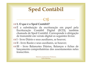 O documento descreve o Sped Contábil, que é a substituição da escrituração contábil em papel pela Escrituração Contábil Digital. Ele explica que o Sped Contábil corresponde à obrigação de transmitir digitalmente livros como o Diário, Razão e Balancetes. Além disso, lista quais pessoas jurídicas são obrigadas a entregar o Sped Contábil e quais livros são abrangidos pelo sistema.