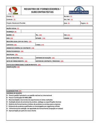 Este documento é um formulário de registro de fornecedores/subcontratados que contém 27 campos solicitando informações como nome do cliente, número do contrato, dados do fornecedor/subcontratado, descrição do produto/serviço, data de início do fornecimento entre outros.