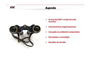 O documento discute a inovação na empresa de serviços Ci&T, notando suas características organizacionais focadas em agilidade, a aplicação de princípios de Lean IT para eliminar desperdícios, e os desafios de gerenciar a inovação considerando fatores econômicos e de mercado.