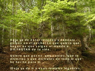 Dio le dice al lector que deje de culparse y castigarse, y en su lugar disfrute de la vida como un regalo. Le pide que confíe en sí mismo y encuentre a Dios dentro y no en libros o lugares, ya que la vida no es una prueba sino una oportunidad para amar y ser libre.