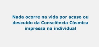 O documento discute os temas do sofrimento, do destino e da dor. Aponta que nada acontece por acaso e que o sofrimento traz aprendizados. Também discute que a riqueza, fama e prazer sensual não trazem felicidade verdadeira e que é preciso ter uma visão mais ampla da ordem do universo para entender o propósito da dor.