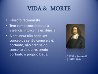 Para Spinoza, Deus é a única substância, equivalente à natureza. Tudo o que existe é parte da essência de Deus e decorre necessariamente dessa essência. Os seres humanos buscam a liberdade através do conhecimento racional que domina as paixões, mas a eterna ordem das coisas representada por Deus não tem paixões.