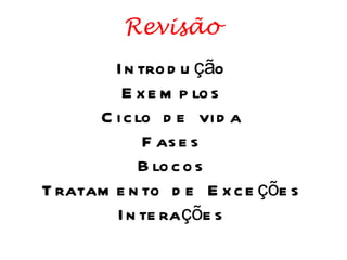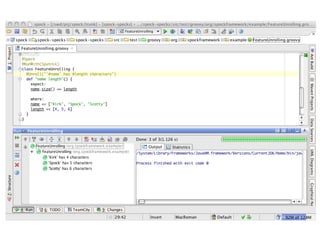 O documento apresenta o framework Spock para testes de software. Discute os principais recursos como blocos expect, then, where e cleanup para validar comportamentos. Também mostra como usar métodos helper para isolar validações e melhorar a legibilidade dos testes.