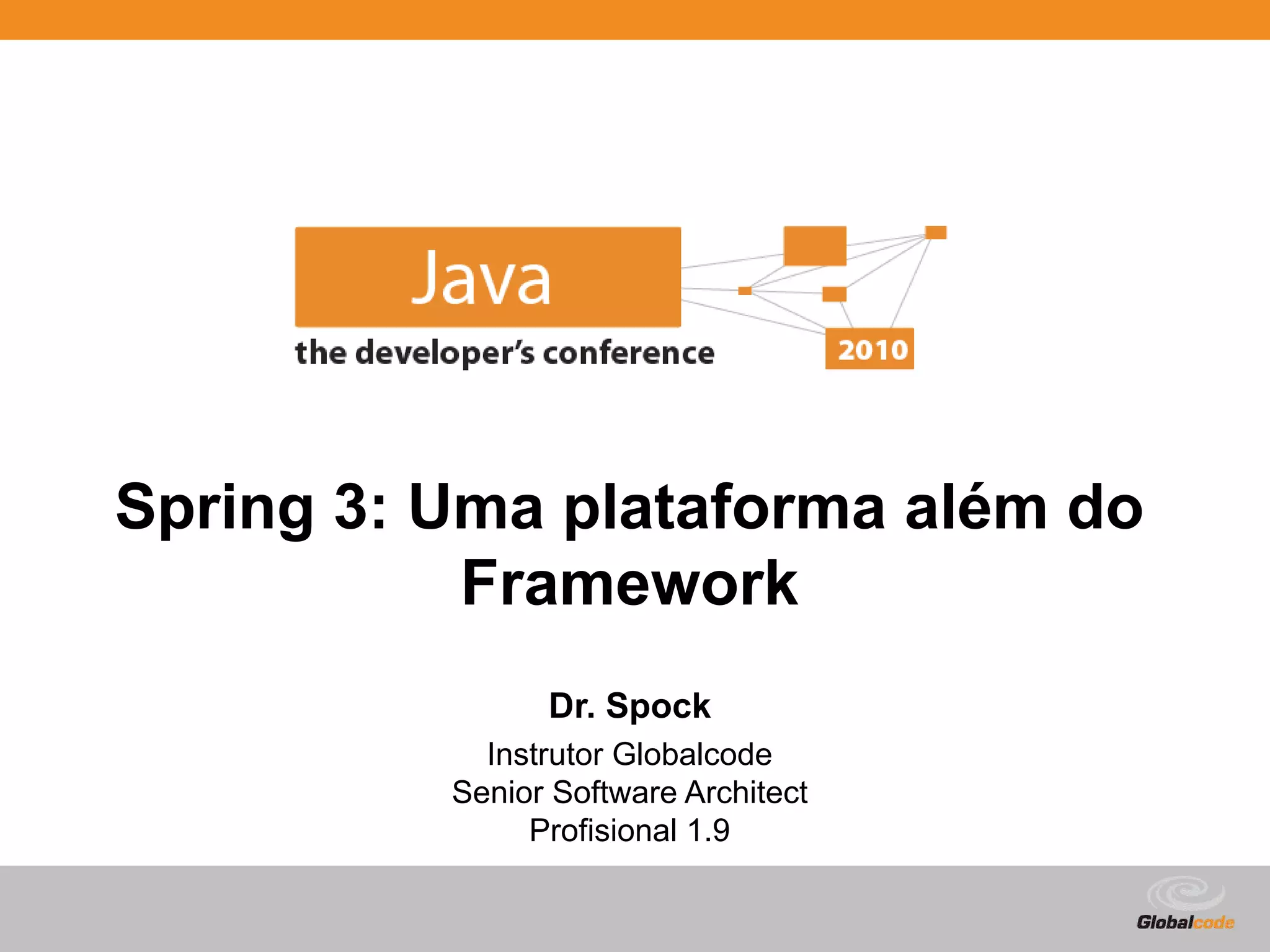 O documento apresenta a plataforma Spring Framework 3, destacando suas características e melhorias, como suporte a Java SE 5+, REST, validação via anotações e a incorporação de módulos adicionais. Além disso, discute a modularidade da arquitetura e a capacidade de integração com outras tecnologias e frameworks. Há também menções a eventos futuros e à evolução do Spring para versões mais recentes.