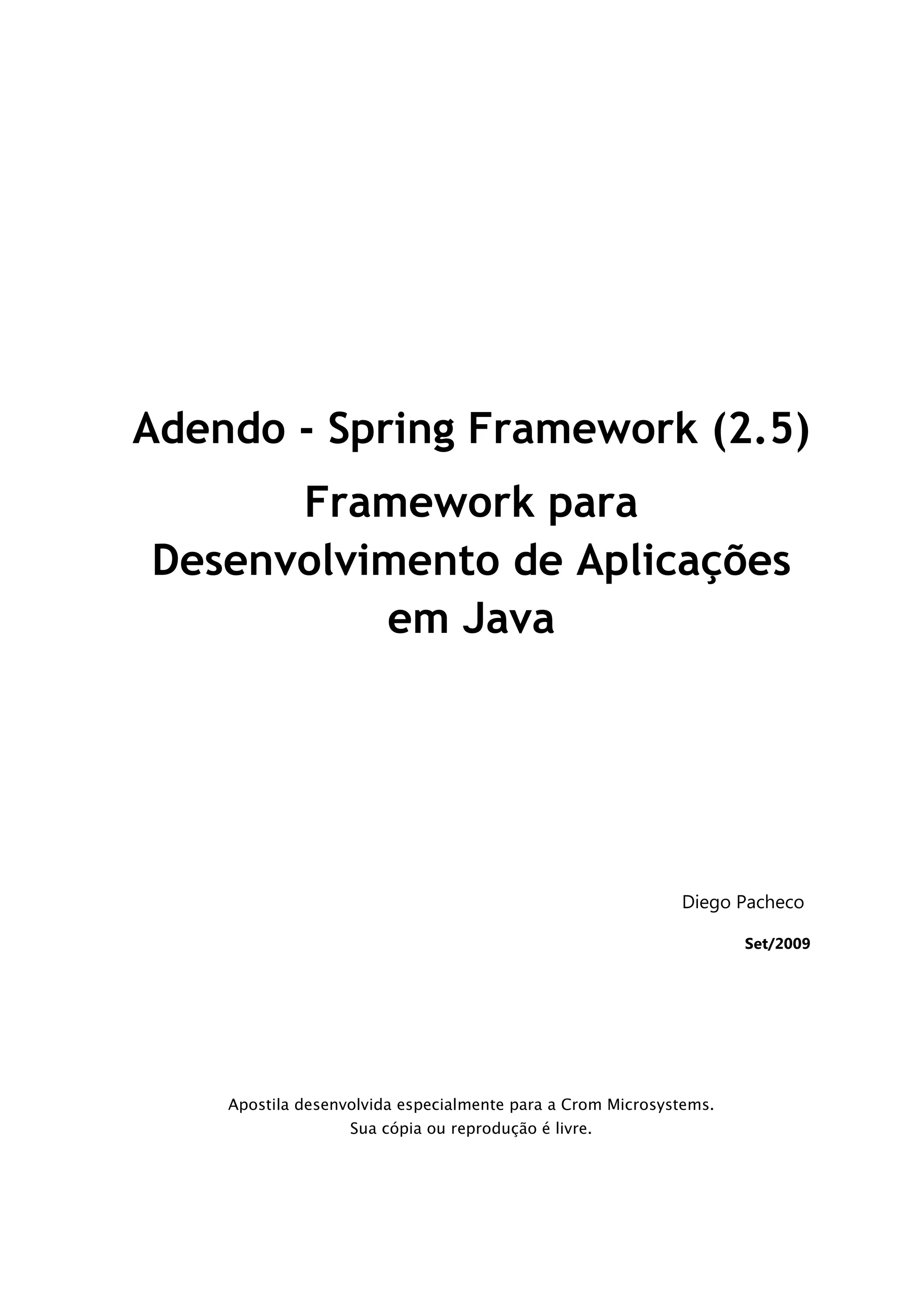 O documento apresenta um adendo sobre o framework Spring Framework versão 2.5, com foco em anotações e integração com web. É apresentado o conceito de anotações no Java e no Spring Framework, com exemplos de uso de anotações para injeção de dependências e integração com JSF.