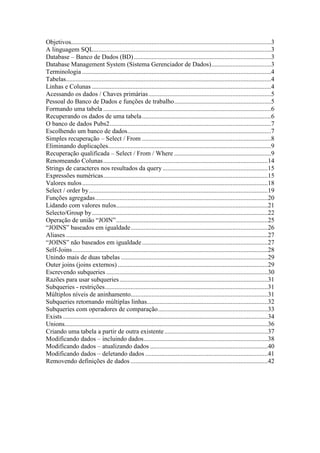 Este documento fornece uma introdução à linguagem SQL, incluindo: 1) os objetivos de aprender SQL; 2) os principais componentes de um banco de dados e como estruturar e acessar dados; 3) como recuperar, filtrar e modificar dados usando comandos SQL básicos.