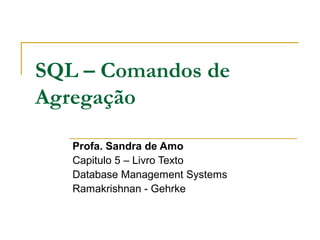 O documento aborda comandos de agregação em SQL, incluindo funções como COUNT, SUM, AVG, MAX e MIN. Exemplos práticos são fornecidos para ilustrar como usar esses operadores com a cláusula GROUP BY e condições específicas. Há também exercícios que enfatizam a aplicação de agregações em diferentes contextos de consulta de dados.