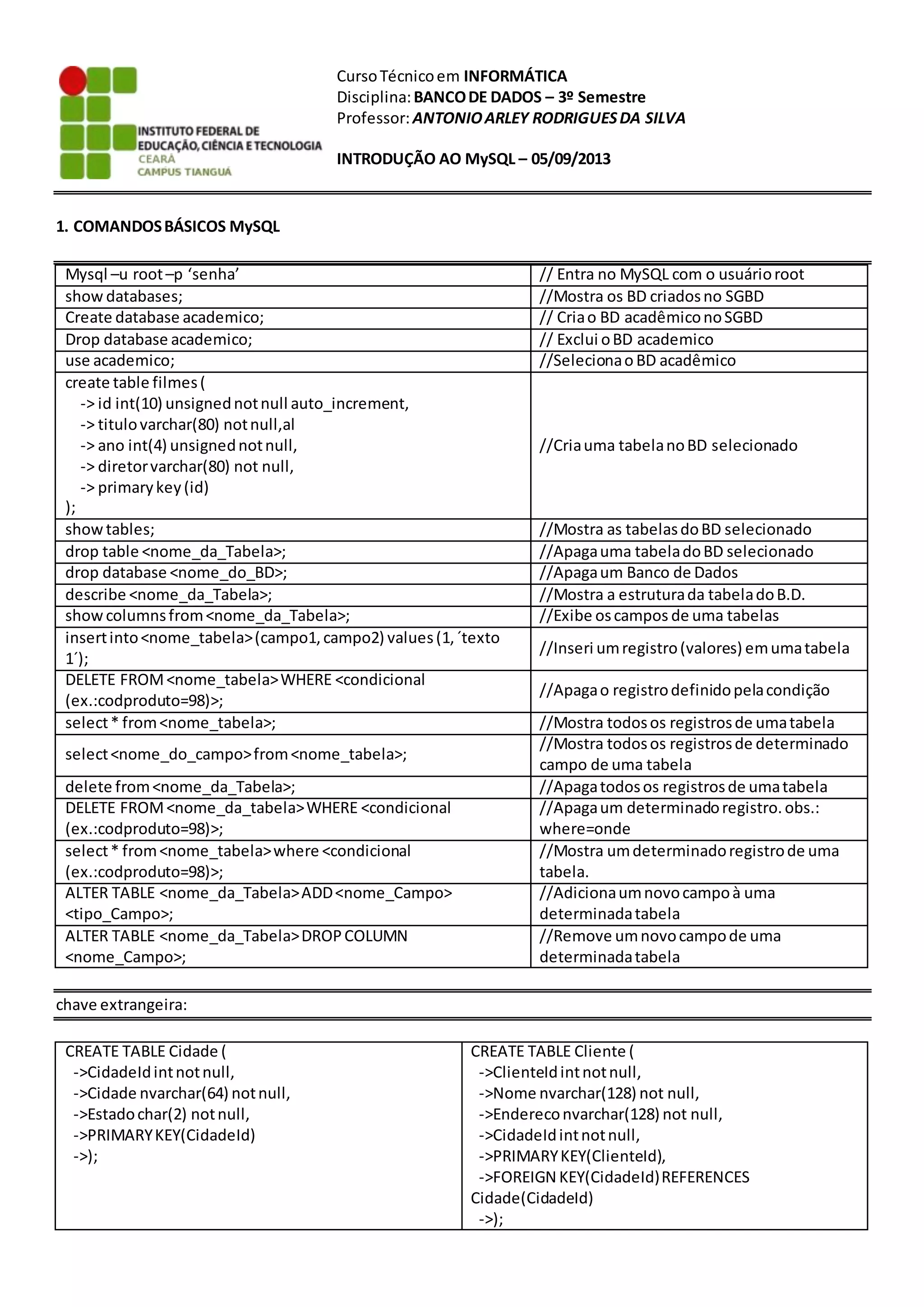 O documento apresenta os principais comandos SQL do MySQL para criação e manipulação de bancos de dados, tabelas, campos e registros. Inclui instruções para criação de tabelas, inserção, consulta e remoção de dados, além de descrever os tipos de dados suportados como numéricos, datas, strings e blobs.