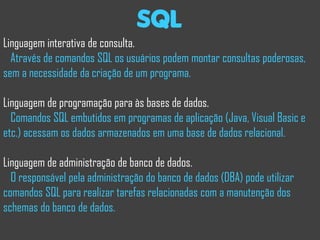 O documento descreve as principais funções da linguagem SQL: 1) permite consultas poderosas aos dados sem programação; 2) é usada em programas para acessar bancos de dados; 3) é usada por administradores para gerenciar bancos de dados.