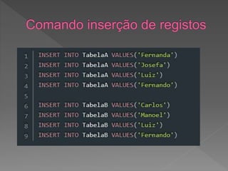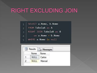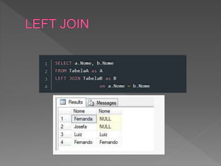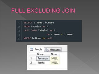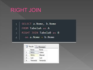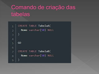 O documento descreve como criar duas tabelas com uma coluna em comum para demonstrar diferentes tipos de junção entre dados. Ele explica como inserir registros nas tabelas para testar junções e então define e explica os resultados dos métodos Inner, Left, Right e Outer Join.