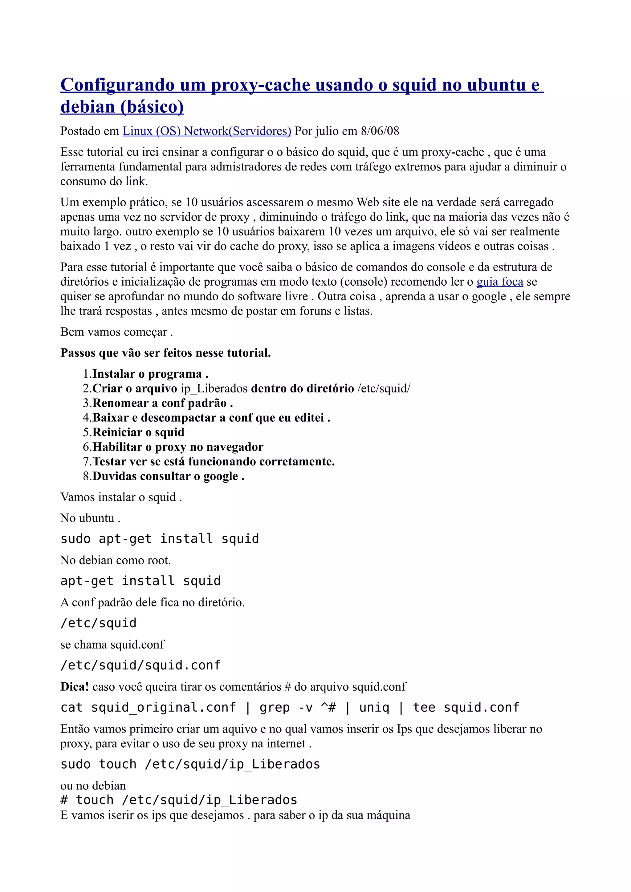 O documento descreve como configurar um proxy cache (squid) no Ubuntu e Debian para melhorar o desempenho da rede e reduzir o uso da banda larga. Ele explica como instalar e configurar o squid, criar arquivos de configuração, habilitar o proxy no navegador e testar a instalação.