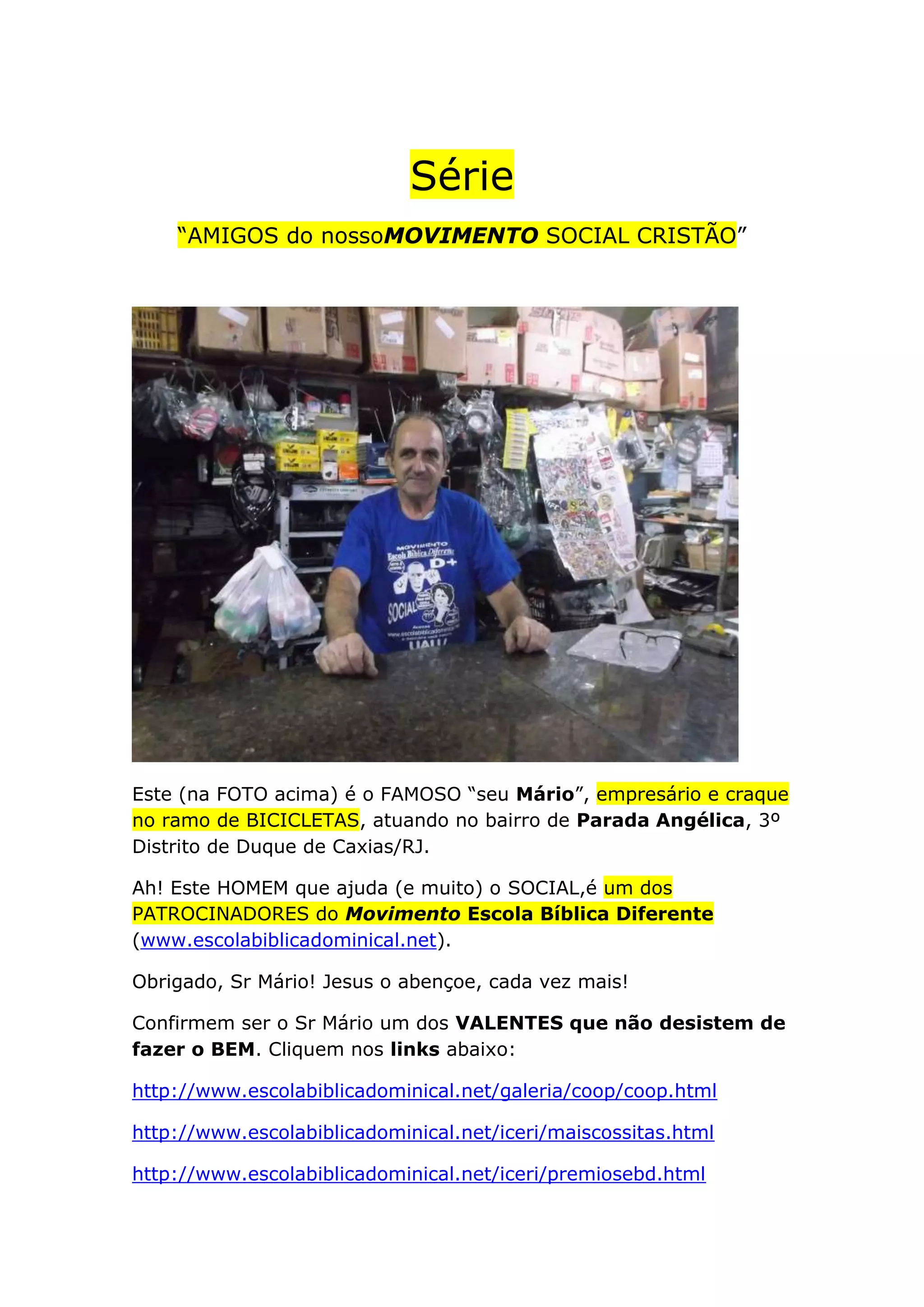 O documento descreve as atividades de apoio social e religioso de duas pessoas na cidade de Duque de Caxias, Rio de Janeiro. O Sr. Mário é um empresário que patrocina o Movimento Escola Bíblica Diferente e ajuda a comunidade. Marcelo e Márcio melhoraram a aparência de uma rua através de seu salão de festas. O Movimento Escola Bíblica Diferente promove o trabalho social cristão nessa região.