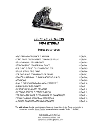 O documento aborda a doutrina da Trindade à luz da Bíblia, questionando a legitimidade de sua interpretação e contextualização nas Escrituras. Ele analisa diferentes concepções sobre Deus, criticando a ideia de um Deus triúno e enfatizando a necessidade de conhecer o 'único Deus verdadeiro' conforme João 17:3. O objetivo é auxiliar na compreensão bíblica sobre o Pai, o Filho e o Espírito Santo, promovendo um estudo que busca respostas fundamentadas nos textos bíblicos.