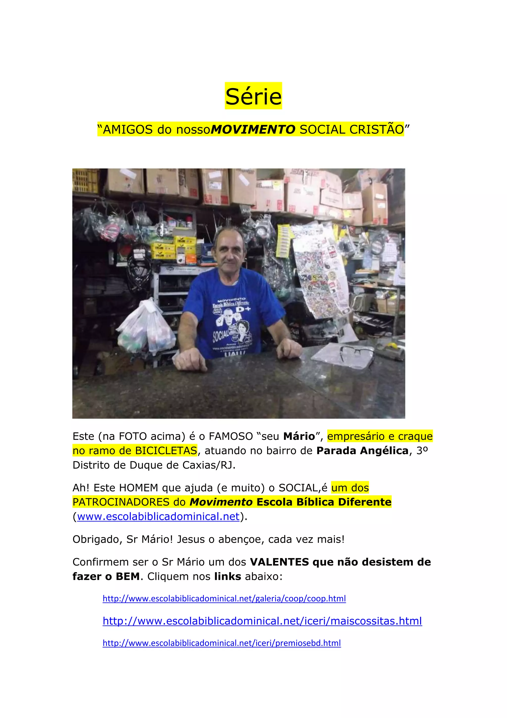 O documento descreve as atividades de apoio social e religioso de duas pessoas na cidade de Duque de Caxias, Rio de Janeiro. O Sr. Mário é um empresário de bicicletas que ajuda o Movimento Escola Bíblica Diferente. Marcelo e Márcio melhoraram a aparência de uma rua através de seu salão de festas. O Movimento promove o trabalho social cristão na região.