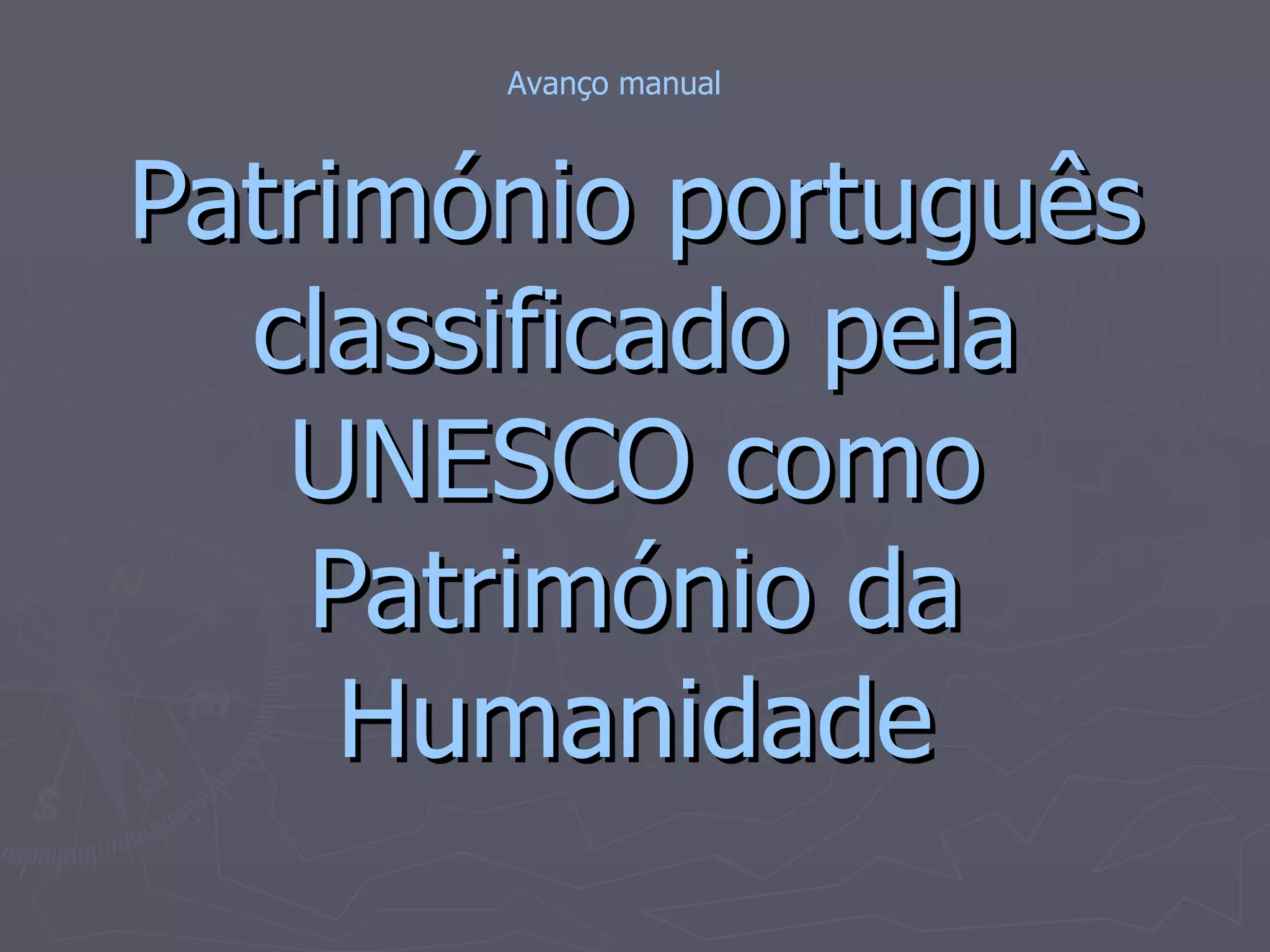 Este documento descreve vários locais portugueses classificados como Património Mundial pela UNESCO, incluindo cidades históricas como Évora, Guimarães e Angra do Heroísmo; mosteiros como Batalha, Alcobaça e Jerónimos; e paisagens naturais como a floresta laurissilva da Madeira e a região vinícola do Douro. Destaca monumentos como a Torre de Belém e o Convento de Cristo em Tomar, e menciona a arte, arquitetura e história que