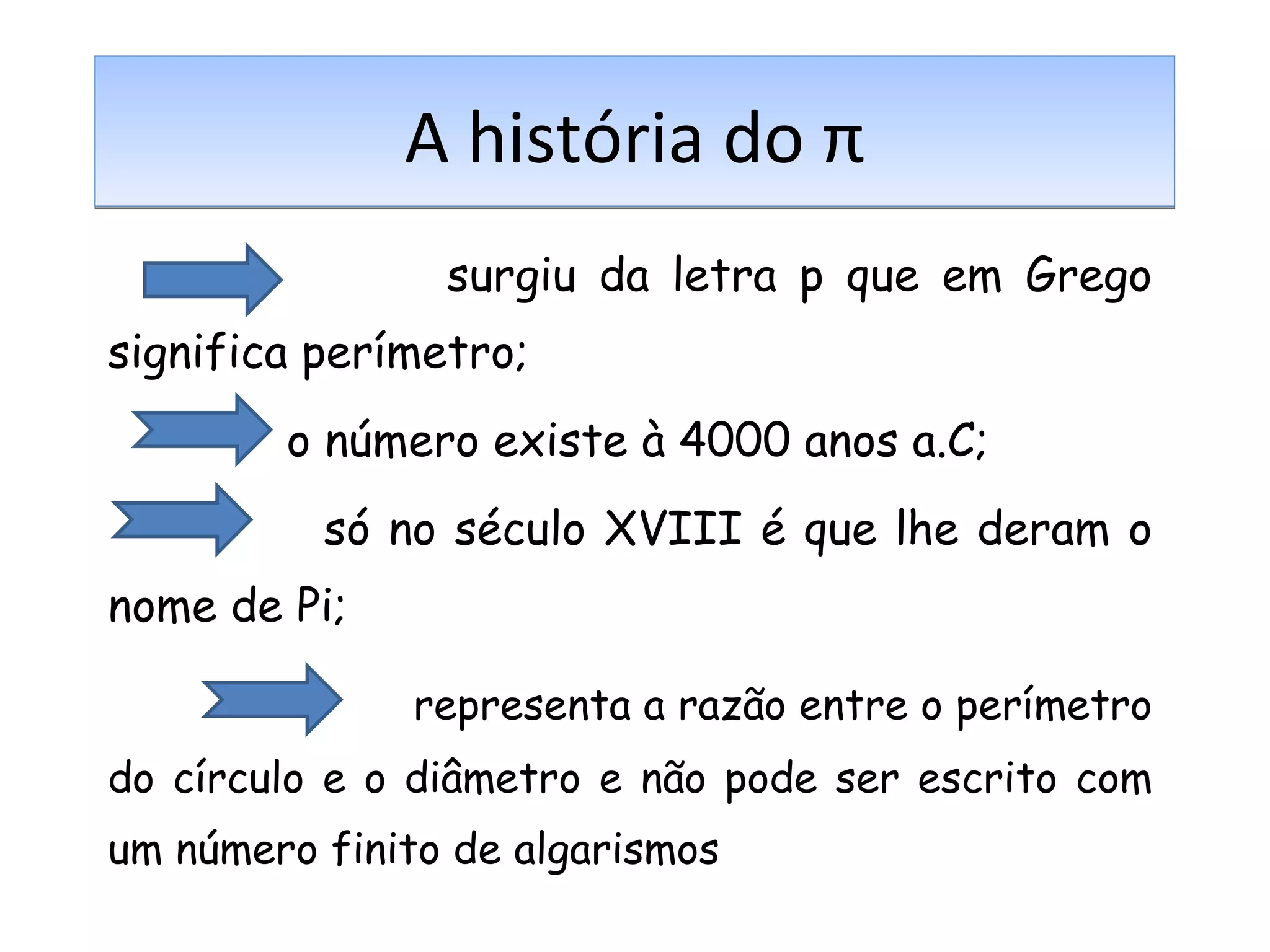 O número π surgiu há cerca de 4000 anos e representa a razão entre o perímetro e o diâmetro de um círculo. Ao longo dos séculos, vários cientistas calcularam cada vez mais casas decimais de π, chegando a 51 trilhões atualmente. O dia 14 de março é dedicado a π por causa da notação 3/14 nos EUA, celebrando-se às 1:59pm para representar 3,14159 arredondado.