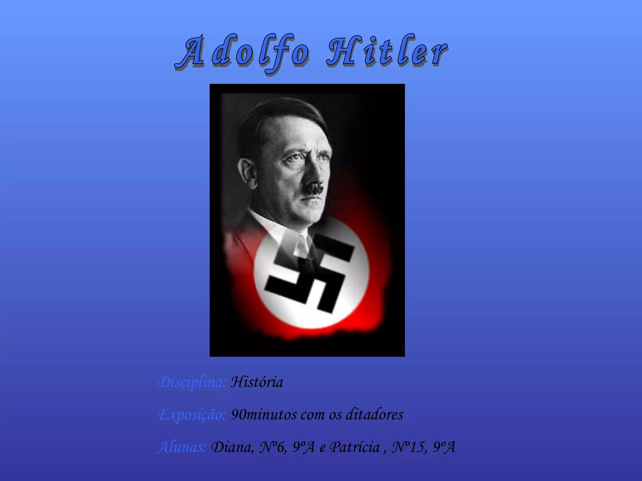Adolfo Hitler nasceu em 1889 na Áustria e se tornou ditador da Alemanha em 1933, liderando o partido nazista. Sob seu comando, a Alemanha iniciou a Segunda Guerra Mundial e promoveu o Holocausto, exterminando milhões de judeus, ciganos e outros grupos. Hitler escreveu Mein Kampf explicando suas ideias racistas e antissemitas. Ele cometeu suicídio em 1945 quando a Alemanha foi derrotada na guerra.