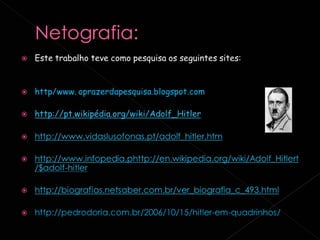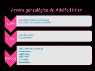 Este documento resume a vida e carreira política de Adolf Hitler. Começa com sua infância na Áustria e ascensão ao poder na Alemanha como líder do partido nazista. Detalha como ele consolidou seu poder ditatorial e lançou a Segunda Guerra Mundial ao invadir a Polônia. Termina descrevendo o suicídio de Hitler em 1945, quando a derrota da Alemanha na guerra estava iminente.