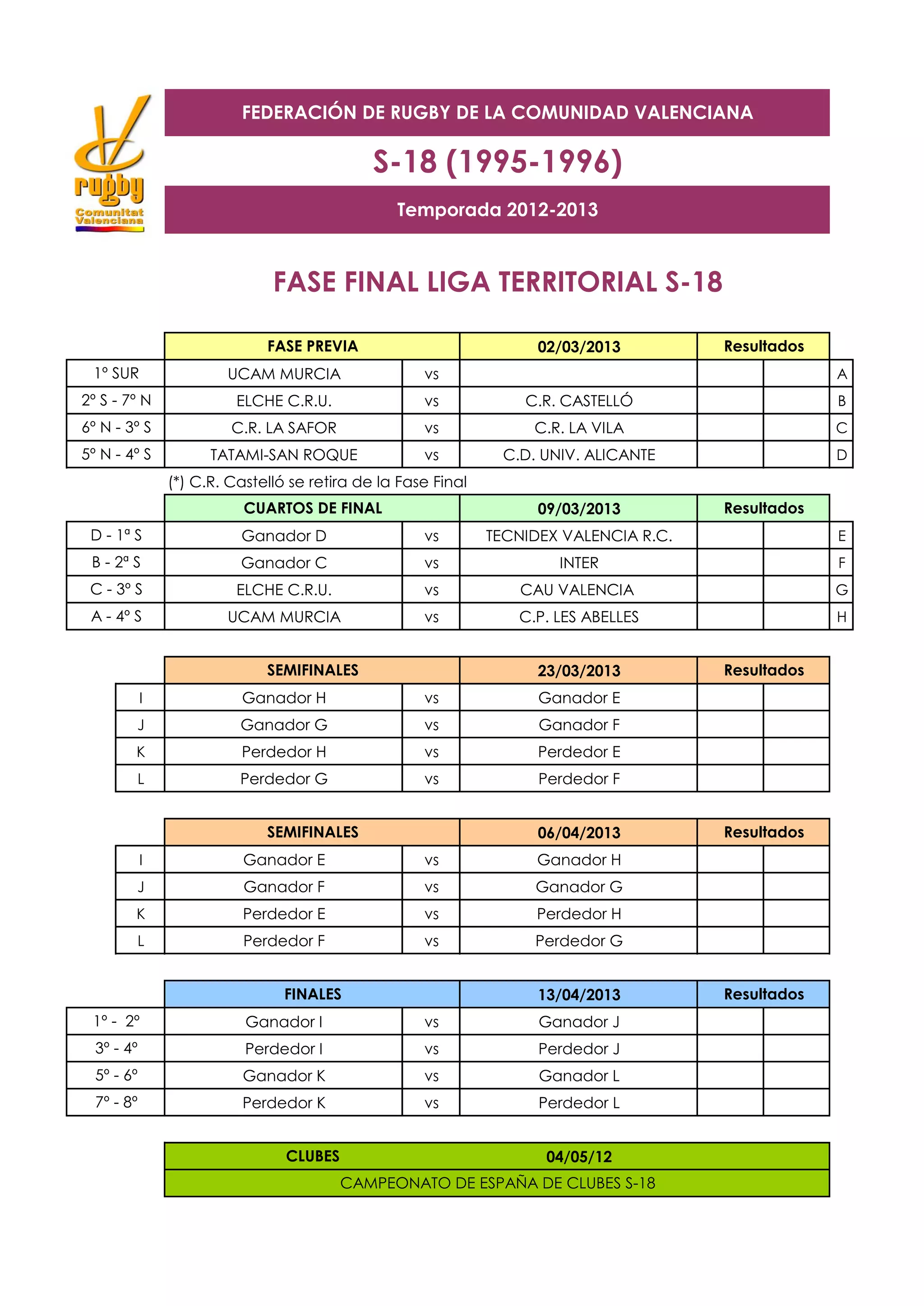 Este documento descreve o cronograma e resultados da fase final da liga territorial S-18 da Comunidade Valenciana para a temporada 2012-2013, incluindo as fases preliminares, quartas-de-final, semifinais e finais realizadas entre fevereiro e maio.