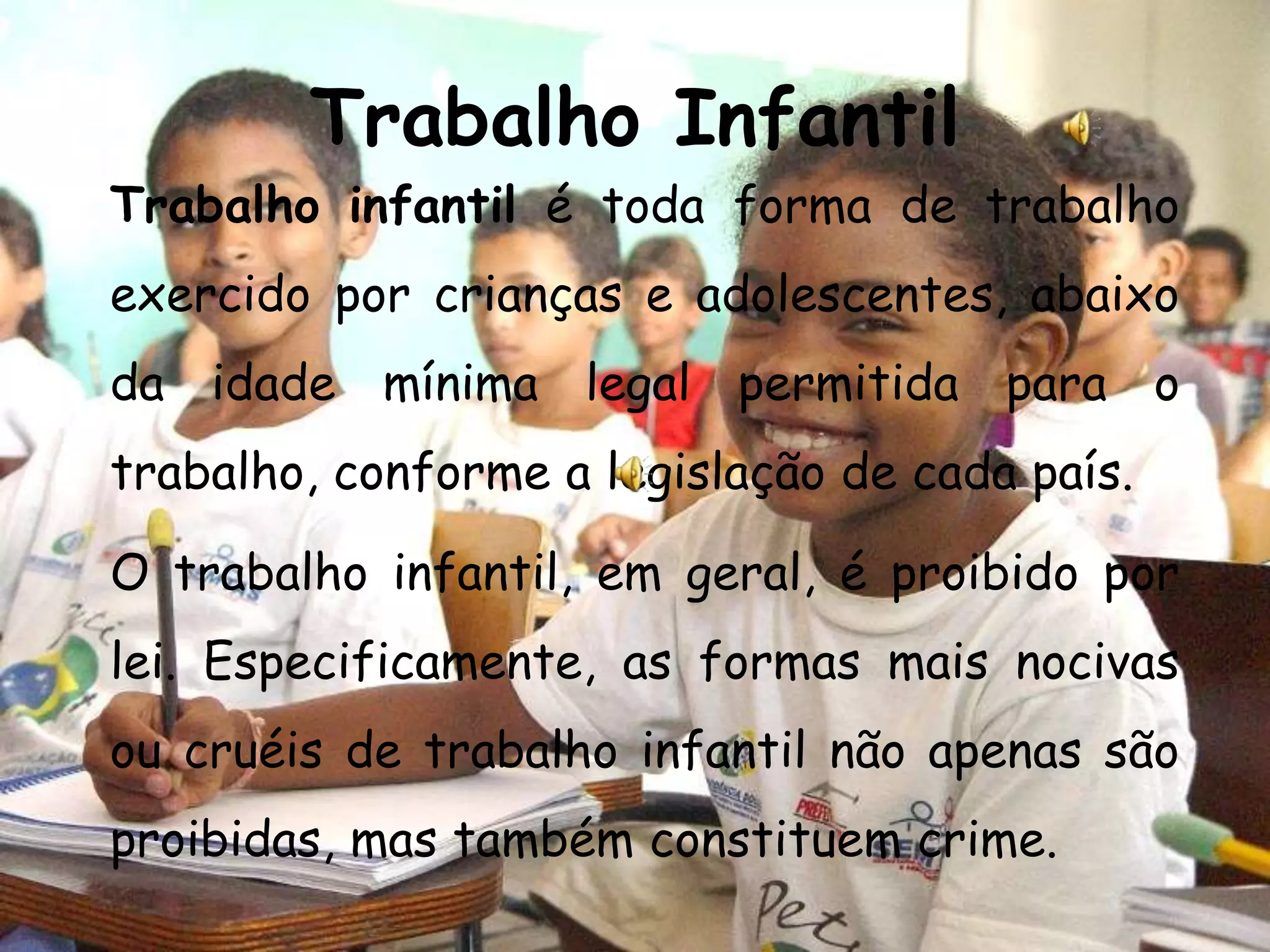 O documento discute o trabalho infantil, definindo-o como qualquer trabalho realizado por crianças abaixo da idade legal permitida. Ele ocorre com mais frequência em países subdesenvolvidos e famílias pobres, e suas piores formas incluem escravidão, prostituição e trabalho perigoso. Embora proibido em Portugal, o trabalho infantil ainda ocorre em pequena escala e traz consequências físicas e psicológicas para as crianças.