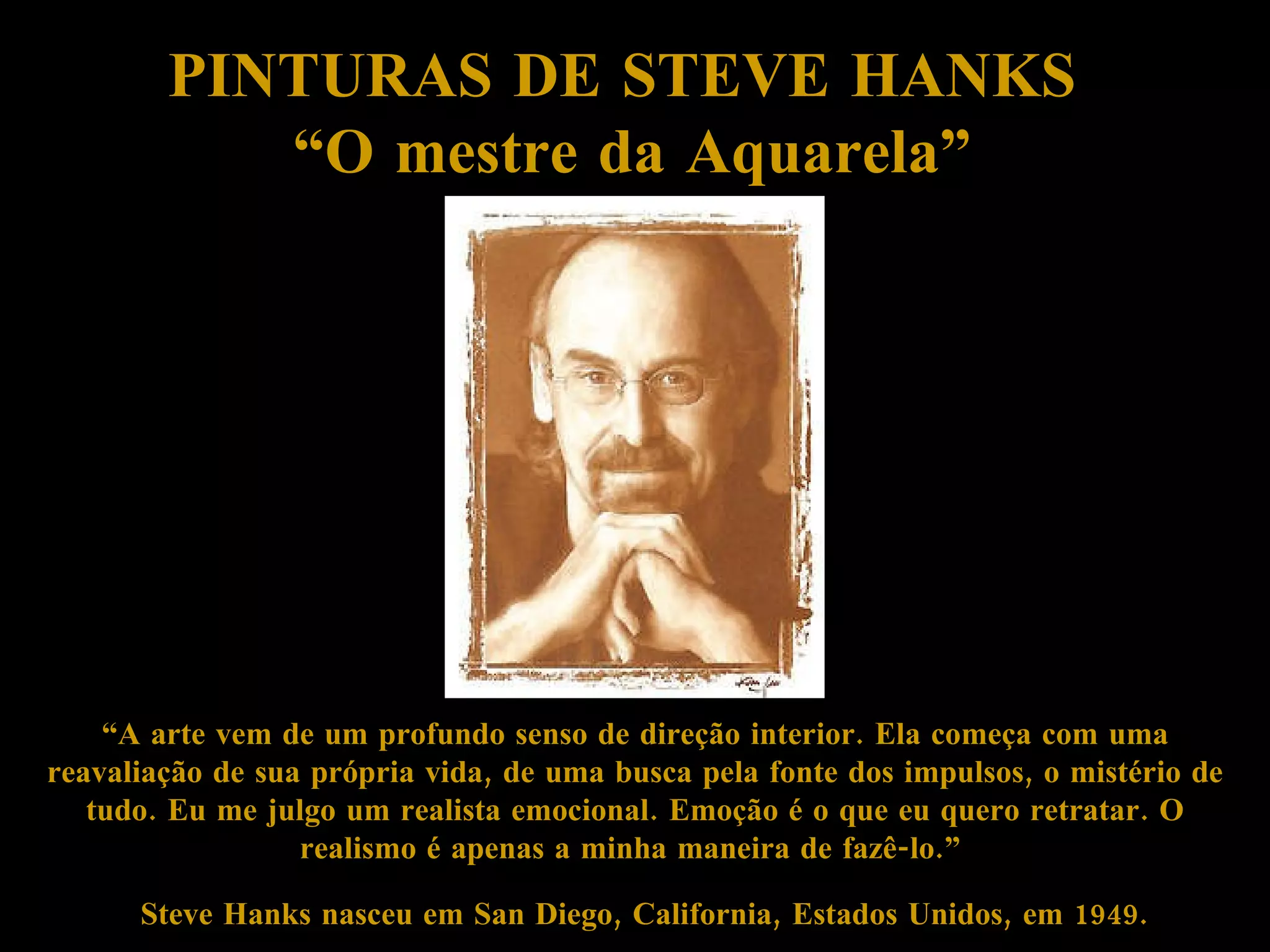 PINTURAS DE STEVEHANKS “ O mestre da Aquarela” Steve Hanks nasceu em San Diego, California, Estados Unidos, em 1949. “ A arte vem de um profundo senso de direção interior. Ela começa com uma reavaliação de sua própria vida, de uma busca pela fonte dos impulsos, o mistério de tudo. Eu me julgo um realista emocional. Emoção é o que eu quero retratar. O realismo é apenas a minha maneira de fazê-lo.”