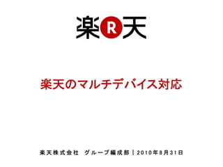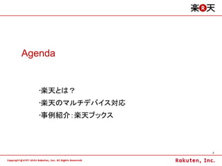 O documento discute a abordagem da Rakuten para dispositivos múltiplos. A empresa otimizou seus sites para smartphones e lançou aplicativos para iPhone, iPad e Android. Análises mostram que a otimização para smartphones aumentou o tráfego, engajamento e conversões. A Rakuten também analisa o comportamento dos usuários entre dispositivos para melhorar os serviços.