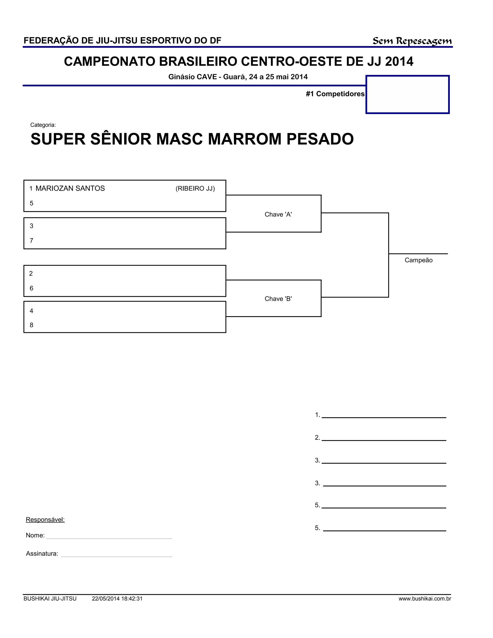 O documento descreve um campeonato brasileiro de jiu-jitsu centro-oeste realizado em Guará em 2014, com competidores na categoria super sênior masculino marrom pesado divididos em chaves A e B e sem repescagem, vencido por Mariozan Santos do Ribeiro JJ.
