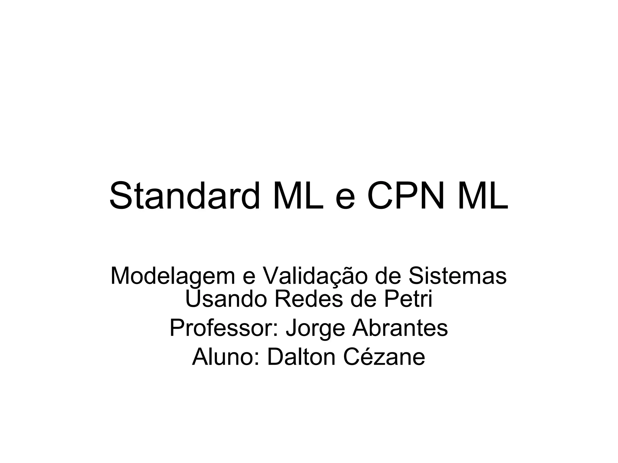 O documento descreve as características da linguagem de programação funcional Standard ML e sua extensão CPN ML, incluindo tipos de dados, declaração de variáveis e funções, recursividade, casamento de padrões e inscrições para modelagem de redes de Petri coloridas.