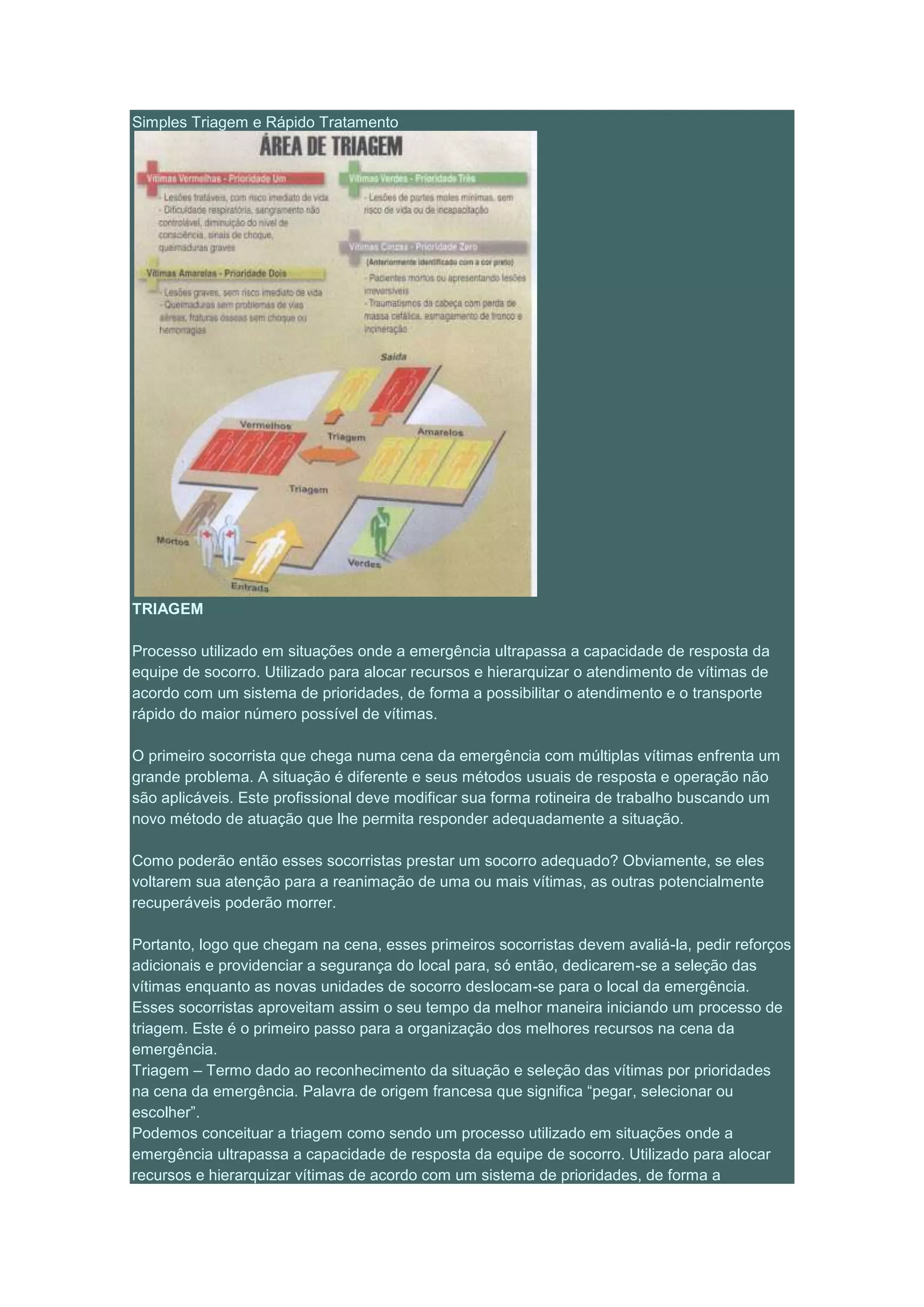 O documento descreve o processo de triagem de vítimas em situações de emergência com múltiplas vítimas, conhecido como Simples Triagem e Rápido Tratamento (START). O método START classifica vítimas em quatro categorias usando cores: vermelho para casos críticos, amarelo para casos menos graves, verde para ferimentos leves e preto para vítimas sem sinais vitais. O primeiro socorrista a chegar deve iniciar a triagem para direcionar os recursos de forma a salvar o maior número possível de vítimas