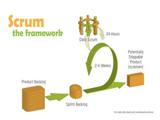 O documento apresenta os princípios e práticas do framework Scrum para gestão de projetos ágeis. Descreve os papéis de Product Owner, Scrum Master e time de desenvolvimento, assim como os eventos de Planning, Daily Scrum, Review e Retrospective realizados a cada Sprint. Explica como estimar esforços, planejar as entregas e acompanhar o progresso por meio do burndown do backlog do produto.