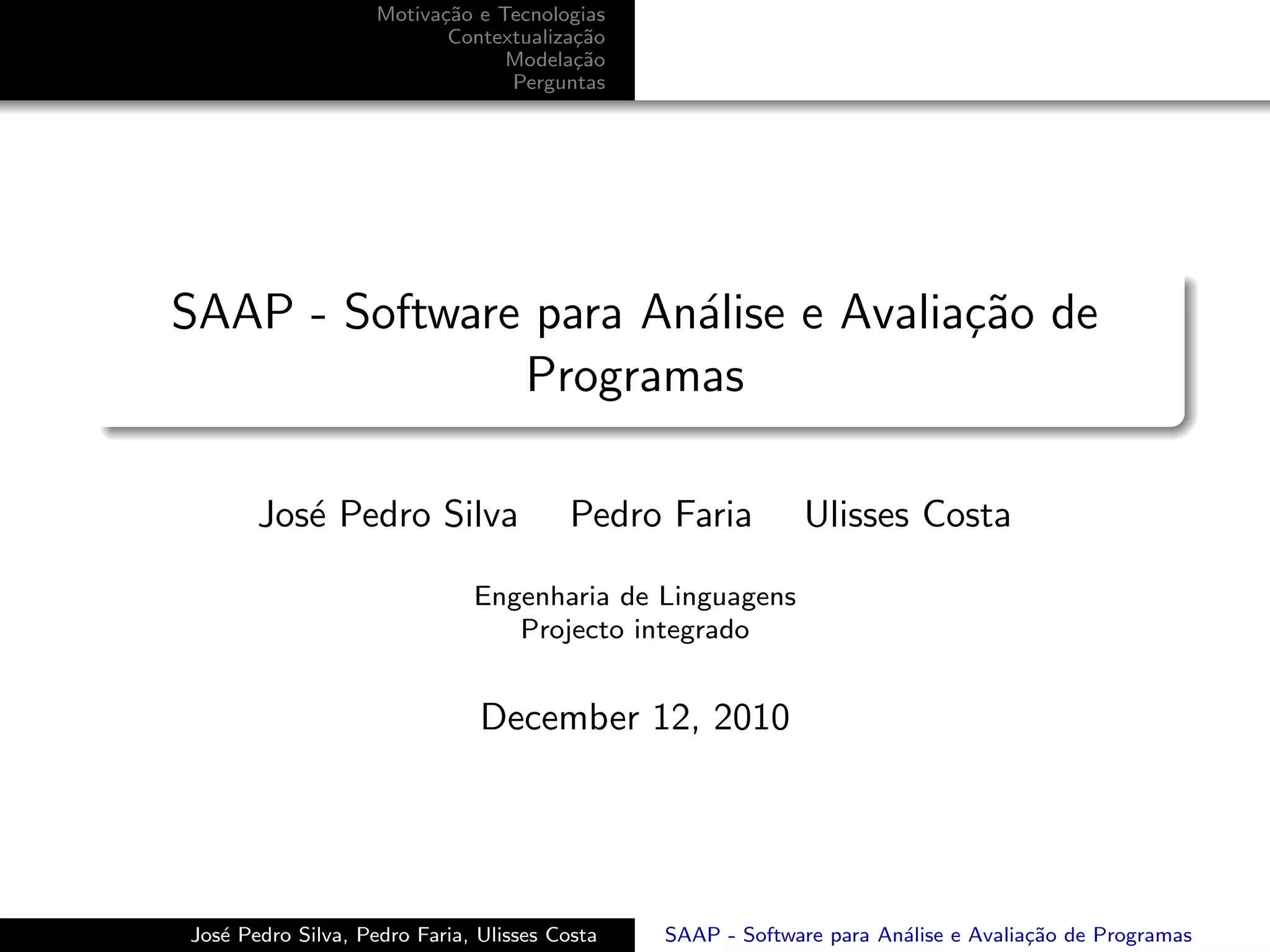 O documento descreve um sistema chamado SAAP para análise e avaliação de programas. O sistema permite a criação de concursos e enunciados, submissão de programas, avaliação dos programas submetidos e geração de métricas. Ele será desenvolvido usando Ruby on Rails, Perl, DB2 e Haskell.