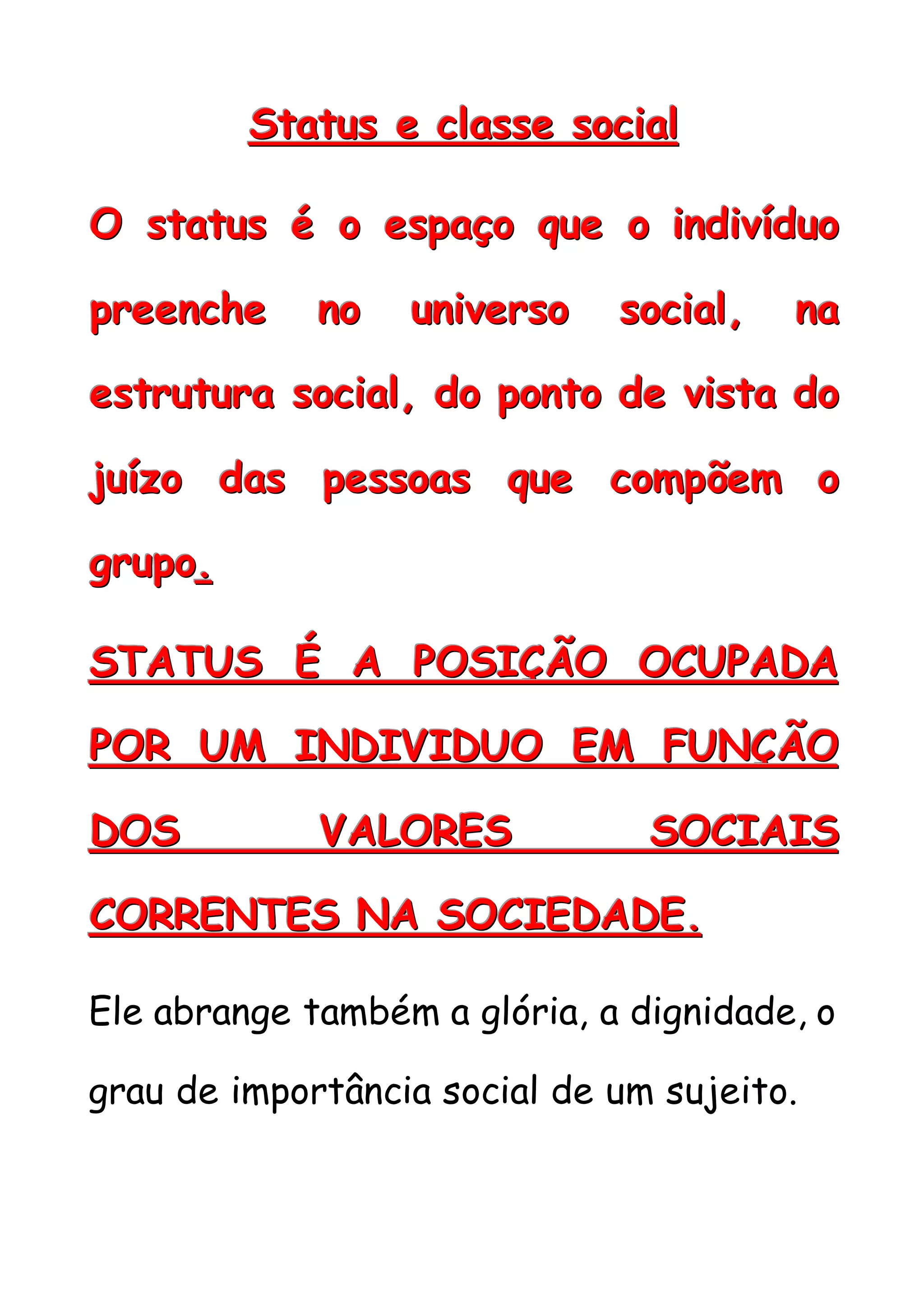 O documento discute os conceitos de status social e processos sociais. Define status social como a posição ocupada por um indivíduo na estrutura social de acordo com atributos como riqueza, educação e ocupação. Apresenta dois tipos de status: atribuído, que depende de fatores como idade e sexo; e adquirido, decorrente de capacidades individuais. Explora também os processos sociais de cooperação e assimilação como formas de estabelecer relações entre indivíduos e grupos sociais.