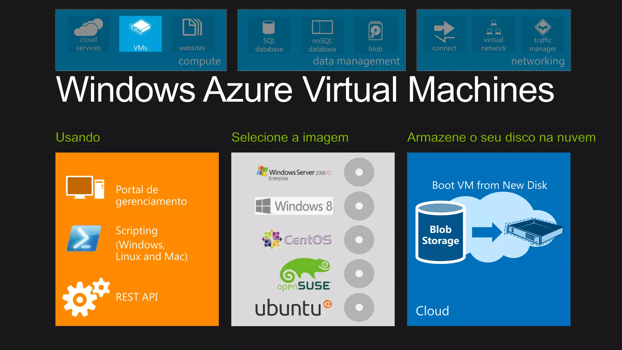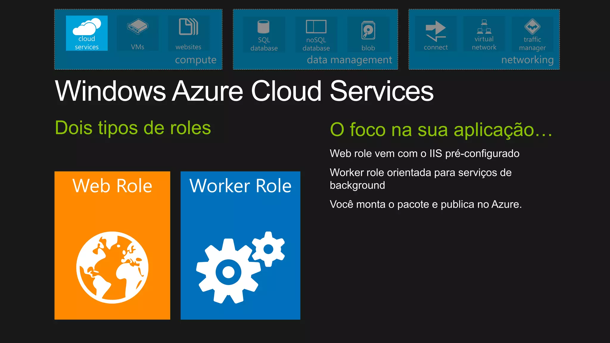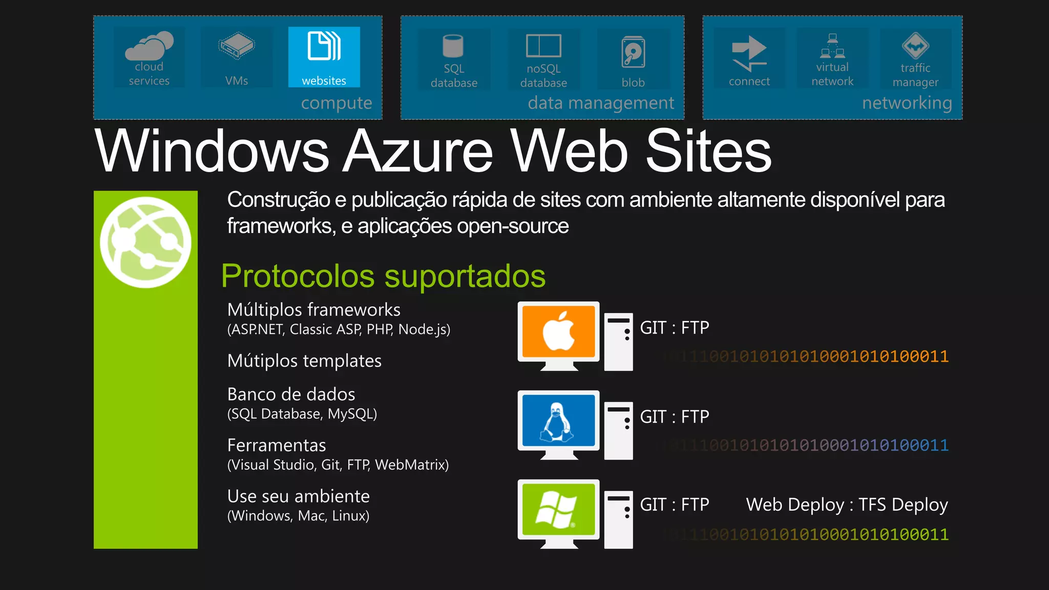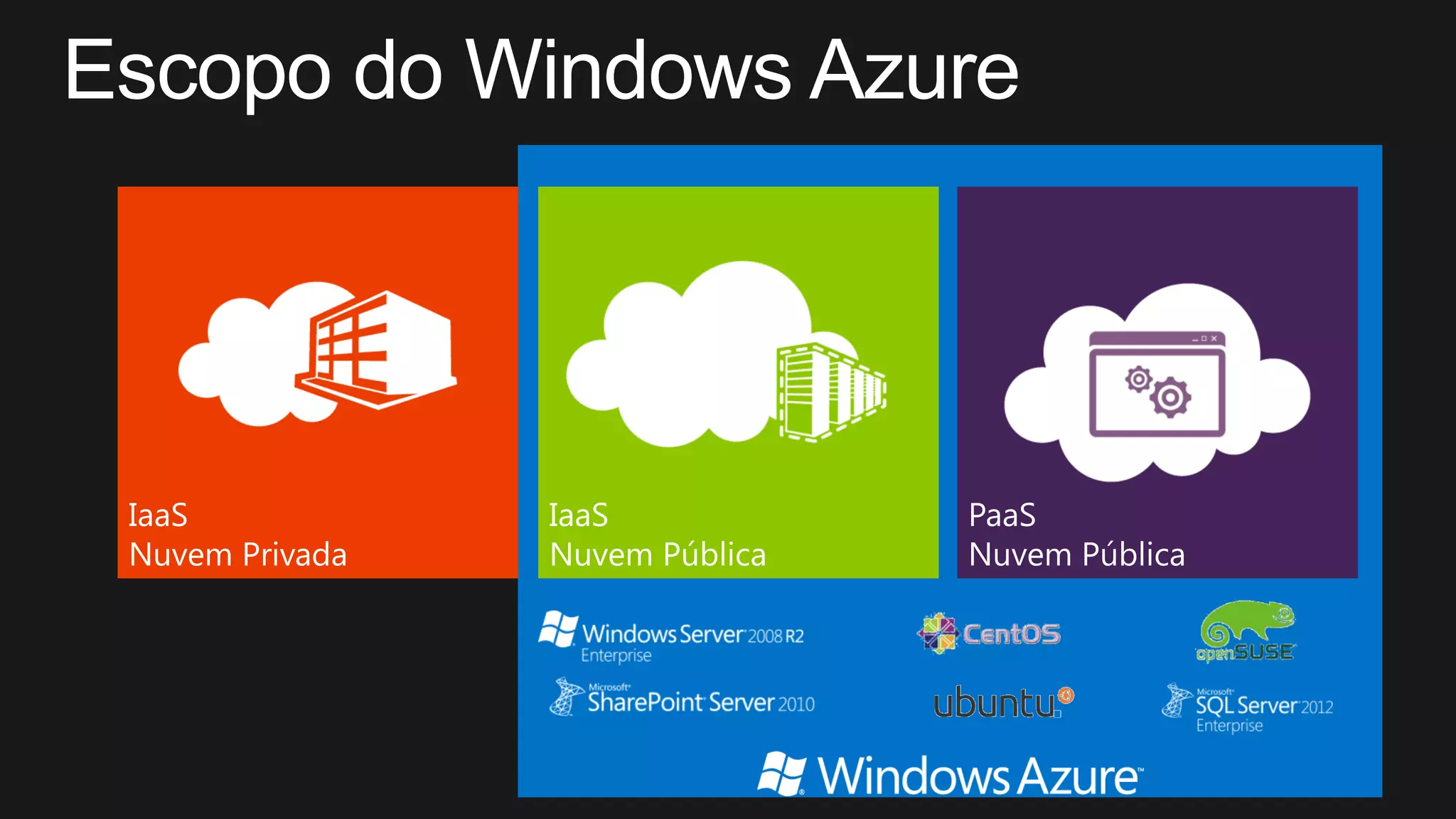Windows Azure é um conjunto de serviços de nuvem projetados para construir e escalar aplicações, oferecendo suporte a sistemas operacionais como Linux e Windows. Os data centers da Azure, espalhados pelo mundo, priorizam eficiência energética e escalabilidade, com uma melhora de 30% a 50% em consumo energético em comparação à média da indústria. O modelo de pagamento é flexível, permitindo contratos de uso e acesso a soluções educacionais.