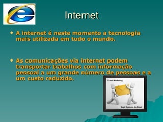O documento descreve as principais tecnologias e conceitos relacionados à internet, incluindo: (1) como a internet se tornou uma das tecnologias mais utilizadas e contribuiu para a sociedade da informação; (2) os diferentes meios de acesso à internet, como cabo, ADSL e Wi-Fi; (3) as unidades básicas de informação digital como bit e byte; e (4) como os computadores usam o sistema binário internamente.