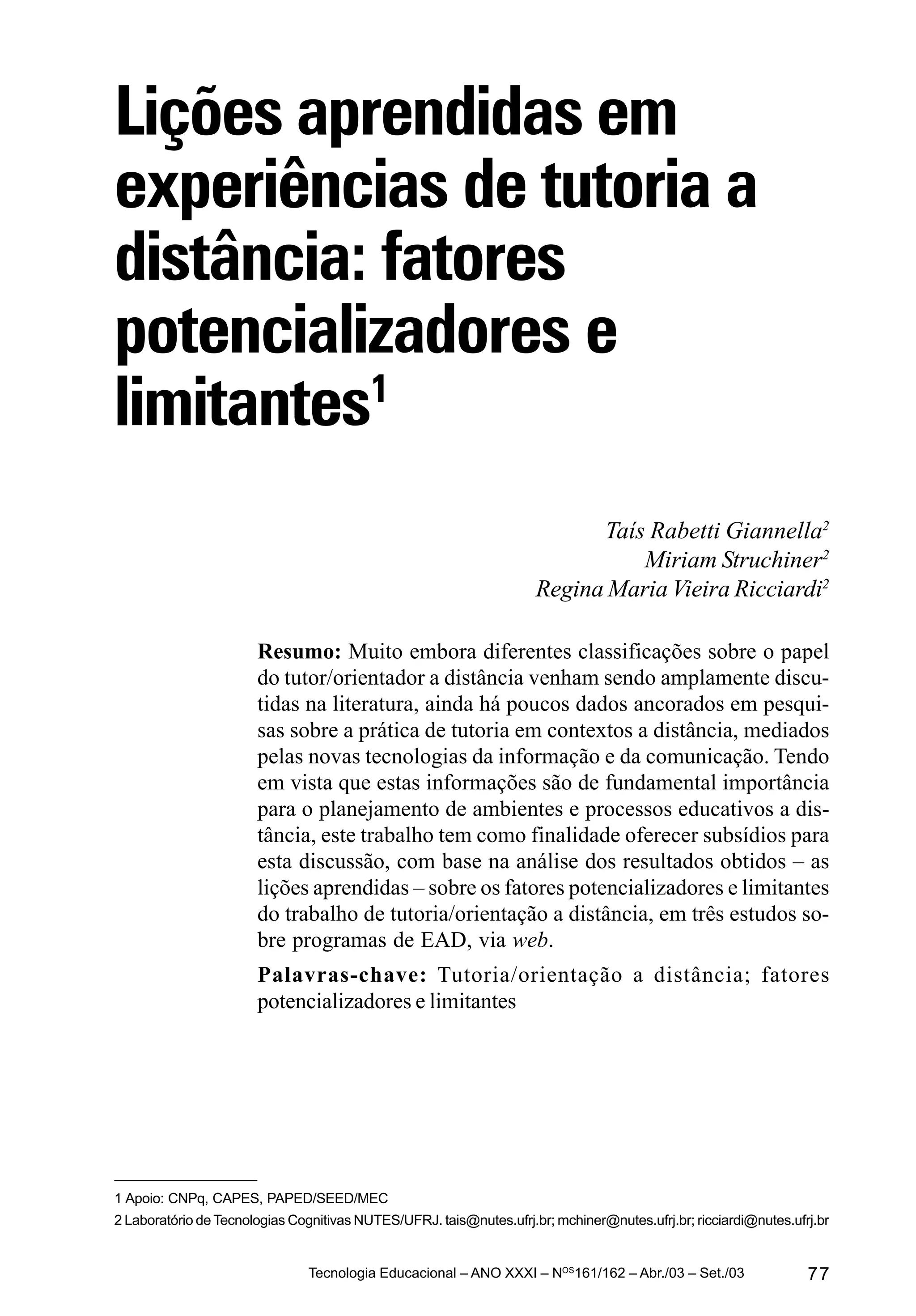 Este documento analisa três experiências de educação a distância e resume os principais fatores que potencializam e limitam o trabalho de tutoria/orientação a distância. Os fatores incluem a seleção e treinamento de tutores, ferramentas de comunicação, e a compreensão do papel do tutor no processo educativo.