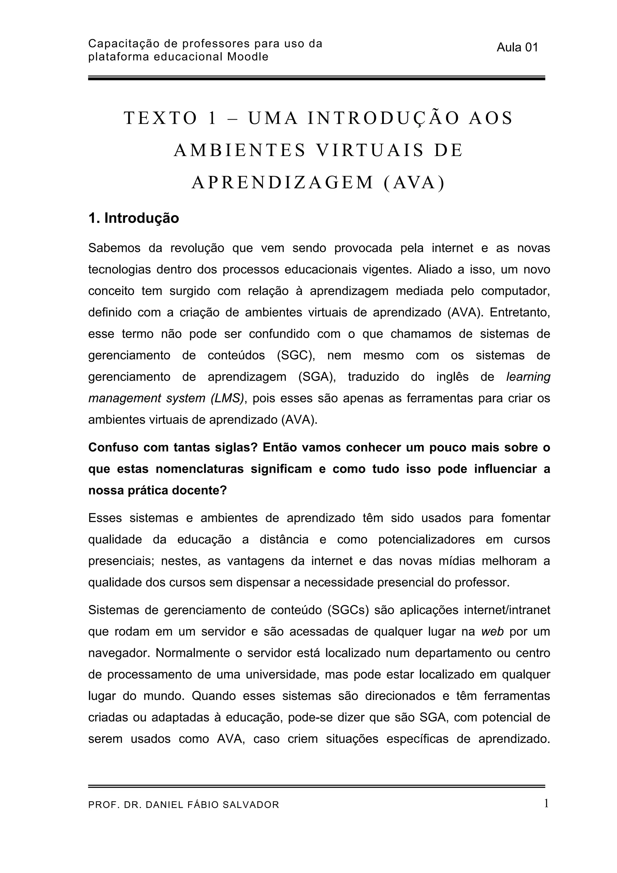 Este documento fornece uma introdução sobre ambientes virtuais de aprendizagem (AVA) e sistemas de gerenciamento de aprendizagem (SGA). Ele explica o que são AVAs, SGAs e sistemas de gerenciamento de conteúdo, e discute as vantagens do uso de SGAs para criar AVAs, incluindo compartilhamento de materiais, ferramentas de discussão, testes, tarefas e notas. Também descreve o Moodle como um SGA de código aberto que tem se tornado popular devido à sua filosofia educ