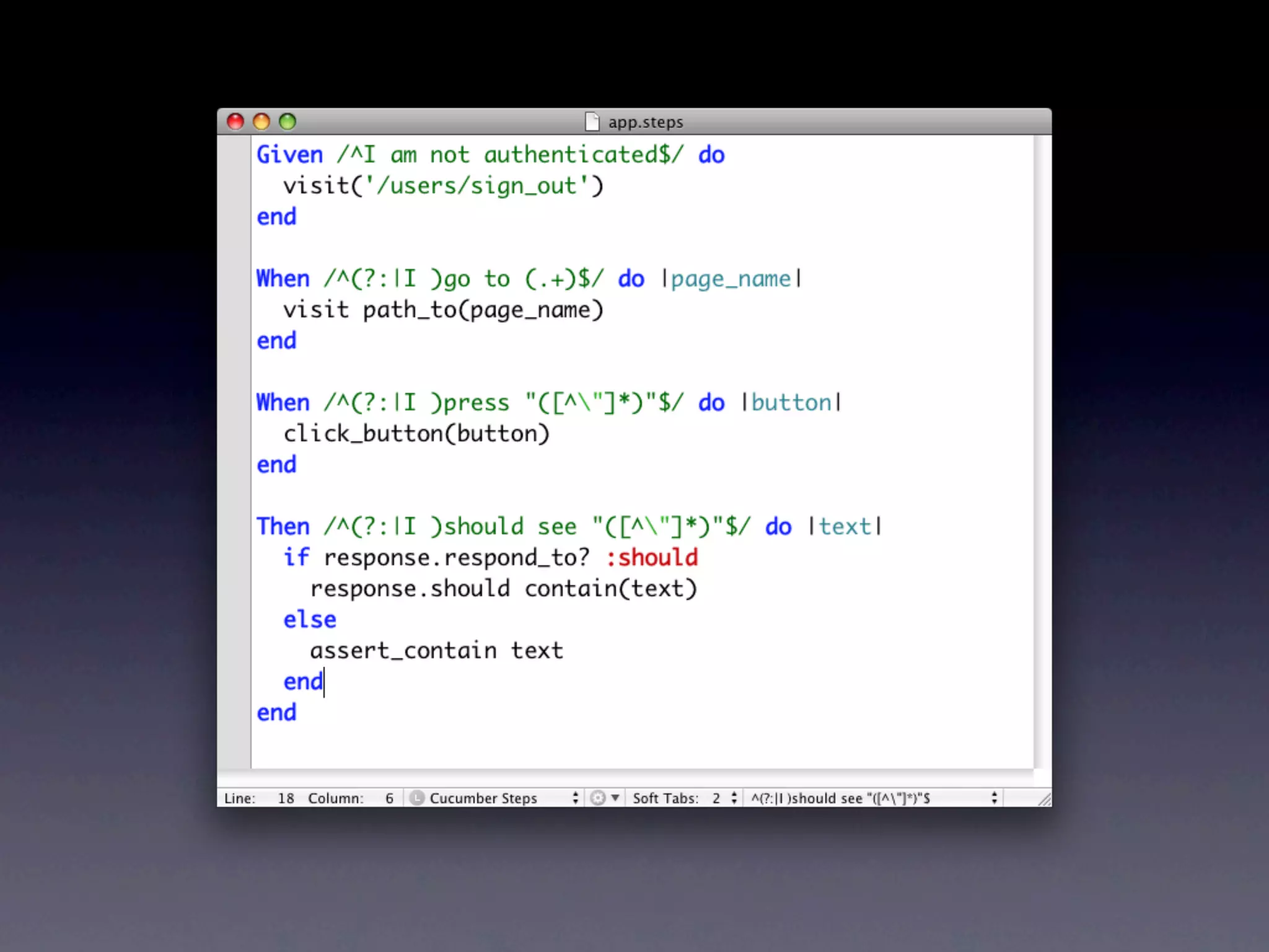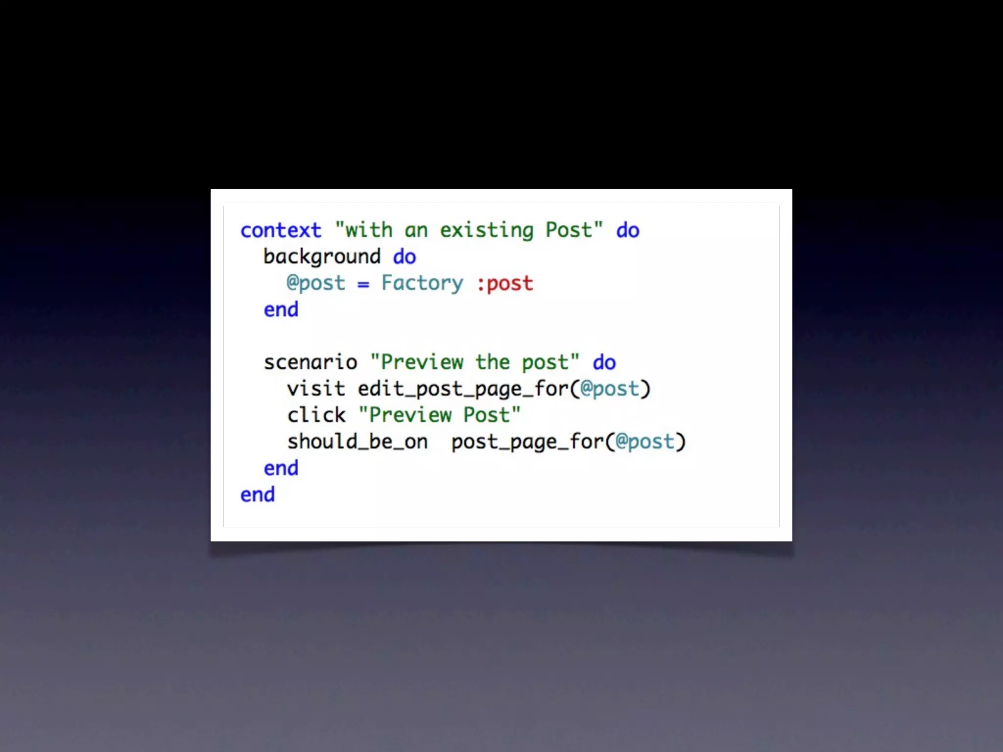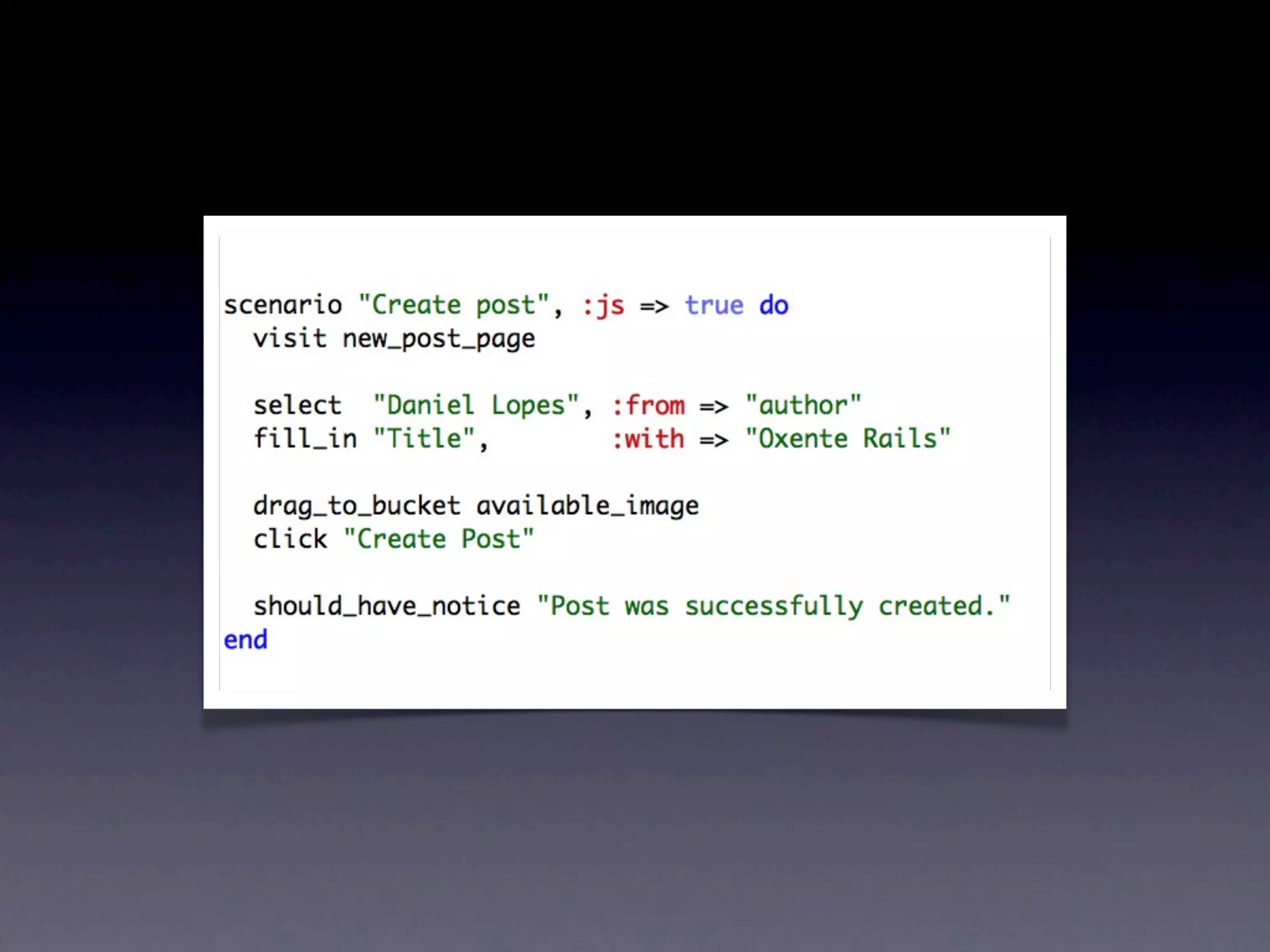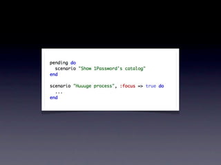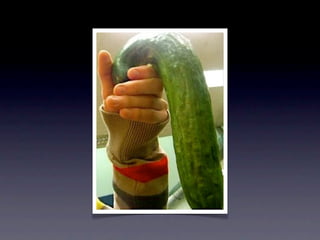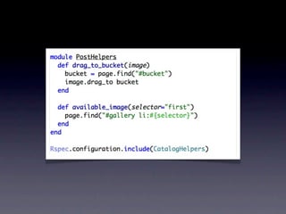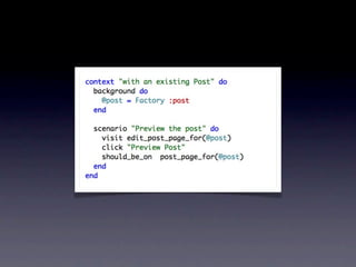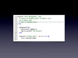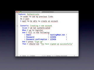 O documento discute ferramentas de teste como Cucumber e RSpec, explicando como elas funcionam e seus benefícios. Também fornece contatos e cursos sobre desenvolvimento web com Ruby on Rails.